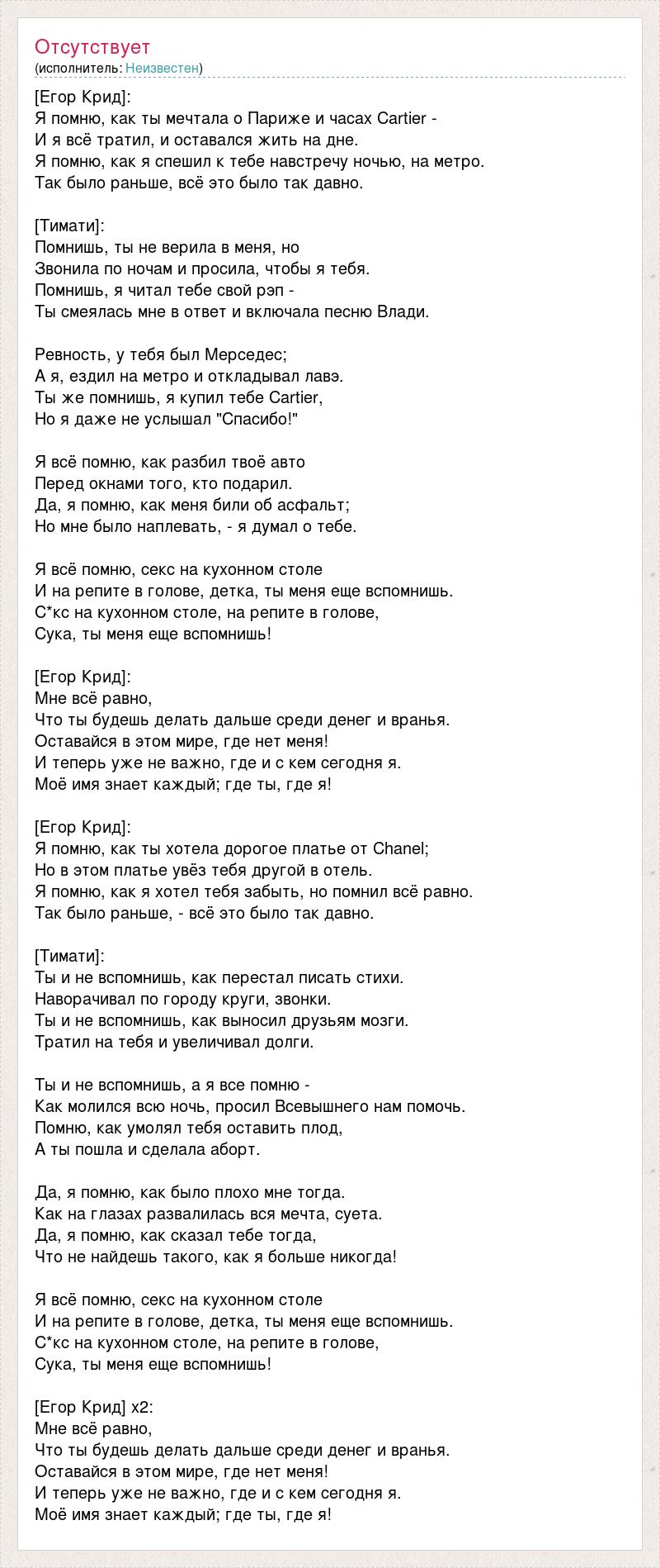 [Егор Крид]: Я помню, как ты мечтала о Париже и часах Cartier - И я всё тратил, и оставался жить на дне. Я помню, как я спешил к тебе навстречу ночью, на метро. Так было раньше, всё это было так давно. [Тимати]: Помнишь, ты не верила в меня, но Звонила по ночам и просила, чтобы я тебя. Помнишь, я читал тебе свой рэп - Ты смеялась мне в ответ и включала песню Влади. Ревность, у тебя был Мерседес; А я, ездил на метро и откладывал лавэ. Ты же помнишь, я купил тебе Cartier, Но я даже не услышал "Спасибо!" Я всё помню, как разбил твоё авто Перед окнами того, кто подарил. Да, я помню, как меня били об асфальт; Но мне было наплевать, - я думал о тебе. Я всё помню, секс на кухонном столе И на репите в голове, детка, ты меня еще вспомнишь. С*кс на кухонном столе, на репите в голове, Сука, ты меня еще вспомнишь! [Егор Крид]: Мне всё равно, Что ты будешь делать дальше среди денег и вранья. Оставайся в этом мире, где нет меня! И теперь уже не важно, где и с кем сегодня я. Моё имя знает каждый; где ты, где я! [Егор Крид]: Я помню, как ты хотела дорогое платье от Chanel; Но в этом платье увёз тебя другой в отель. Я помню, как я хотел тебя забыть, но помнил всё равно. Так было раньше, - всё это было так давно. [Тимати]: Ты и не вспомнишь, как перестал писать стихи. Наворачивал по городу круги, звонки. Ты и не вспомнишь, как выносил друзьям мозги. Тратил на тебя и увеличивал долги. Ты и не вспомнишь, а я все помню - Как молился всю ночь, просил Всевышнего нам помочь. Помню, как умолял тебя оставить плод, А ты пошла и сделала аборт. Да, я помню, как было плохо мне тогда. Как на глазах развалилась вся мечта, суета. Да, я помню, как сказал тебе тогда, Что не найдешь такого, как я больше никогда! Я всё помню, секс на кухонном столе И на репите в голове, детка, ты меня еще вспомнишь. С*кс на кухонном столе, на репите в голове, Сука, ты меня еще вспомнишь! [Егор Крид] х2: Мне всё равно, Что ты будешь делать дальше среди денег и вранья. Оставайся в этом мире, где нет меня! И теперь уже не важно, где и с кем сегодня я. Моё имя знает каждый; где ты, где я!