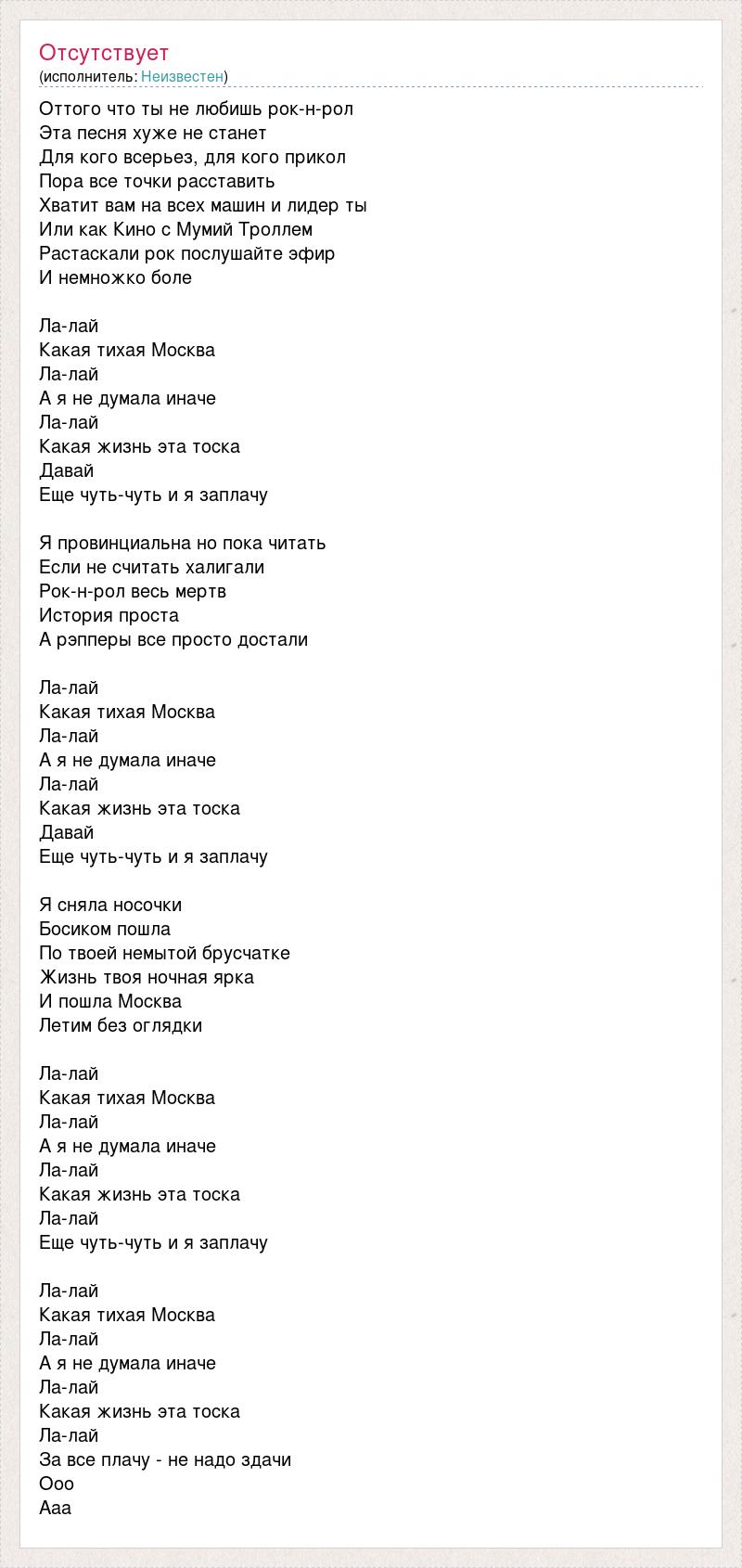 Оттого что ты не любишь рок-н-рол Эта песня хуже не станет Для кого всерьез, для кого прикол Пора все точки расставить Хватит вам на всех машин и лидер ты Или как Кино с Мумий Троллем Растаскали рок послушайте эфир И немножко боле Ла-лай Какая тихая Москва Ла-лай А я не думала иначе Ла-лай Какая жизнь эта тоска Давай Еще чуть-чуть и я заплачу Я провинциальна но пока читать Если не считать халигали Рок-н-рол весь мертв История проста А рэпперы все просто достали Ла-лай Какая тихая Москва Ла-лай А я не думала иначе Ла-лай Какая жизнь эта тоска Давай Еще чуть-чуть и я заплачу Я сняла носочки Босиком пошла По твоей немытой брусчатке Жизнь твоя ночная ярка И пошла Москва Летим без оглядки Ла-лай Какая тихая Москва Ла-лай А я не думала иначе Ла-лай Какая жизнь эта тоска Ла-лай Еще чуть-чуть и я заплачу Ла-лай Какая тихая Москва Ла-лай А я не думала иначе Ла-лай Какая жизнь эта тоска Ла-лай За все плачу - не надо здачи Ооо Ааа