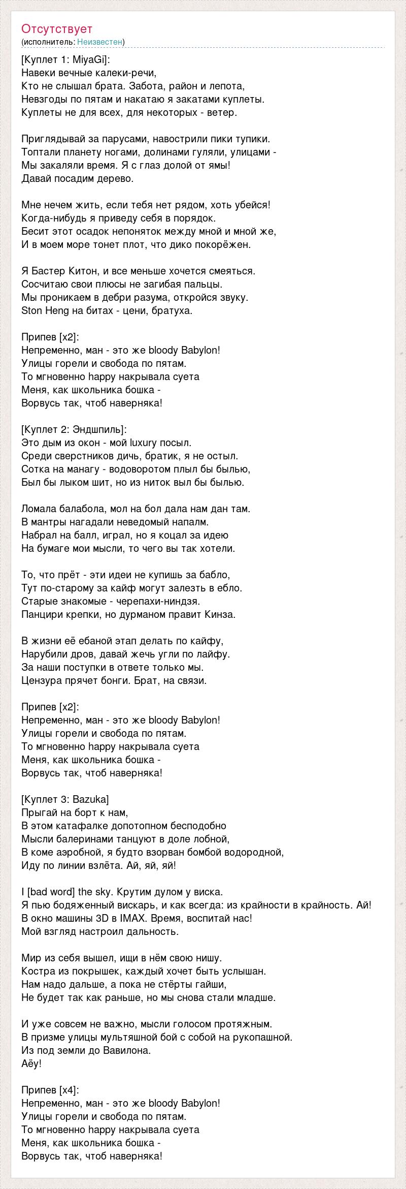 [Куплет 1: MiyaGi]: Навеки вечные калеки-речи, Кто не слышал брата. Забота, район и лепота, Невзгоды по пятам и накатаю я закатами куплеты. Куплеты не для всех, для некоторых - ветер. Приглядывай за парусами, навострили пики тупики. Топтали планету ногами, долинами гуляли, улицами - Мы закаляли время. Я с глаз долой от ямы! Давай посадим дерево. Мне нечем жить, если тебя нет рядом, хоть убейся! Когда-нибудь я приведу себя в порядок. Бесит этот осадок непоняток между мной и мной же, И в моем море тонет плот, что дико покорёжен. Я Бастер Китон, и все меньше хочется смеяться. Сосчитаю свои плюсы не загибая пальцы. Мы проникаем в дебри разума, откройся звуку. Ston Heng на битах - цени, братуха. Припев [х2]: Непременно, ман - это же bloody Babylon! Улицы горели и свобода по пятам. То мгновенно happy накрывала суета Меня, как школьника бошка - Ворвусь так, чтоб наверняка! [Куплет 2: Эндшпиль]: Это дым из окон - мой luxury посыл. Среди сверстников дичь, братик, я не остыл. Сотка на манагу - водоворотом плыл бы былью, Был бы лыком шит, но из ниток выл бы былью. Ломала балабола, мол на бол дала нам дан там. В мантры нагадали неведомый напалм. Набрал на балл, играл, но я коцал за идею На бумаге мои мысли, то чего вы так хотели. То, что прёт - эти идеи не купишь за бабло, Тут по-старому за кайф могут залезть в ебло. Старые знакомые - черепахи-ниндзя. Панцири крепки, но дурманом правит Кинза. В жизни её ебаной этап делать по кайфу, Нарубили дров, давай жечь угли по лайфу. За наши поступки в ответе только мы. Цензура прячет бонги. Брат, на связи. Припев [х2]: Непременно, ман - это же bloody Babylon! Улицы горели и свобода по пятам. То мгновенно happy накрывала суета Меня, как школьника бошка - Ворвусь так, чтоб наверняка! [Куплет 3: Bazuka] Прыгай на борт к нам, В этом катафалке допотопном бесподобно Мысли балеринами танцуют в доле лобной, В коме аэробной, я будто взорван бомбой водородной, Иду по линии взлёта. Ай, яй, яй! I [bad word] the sky. Крутим дулом у виска. Я пью бодяженный вискарь, и как всегда: из крайности в крайность. Ай! В окно машины 3D в IMAX. Время, воспитай нас! Мой взгляд настроил дальность. Мир из себя вышел, ищи в нём свою нишу. Костра из покрышек, каждый хочет быть услышан. Нам надо дальше, а пока не стёрты гайши, Не будет так как раньше, но мы снова стали младше. И уже совсем не важно, мысли голосом протяжным. В призме улицы мультяшной бой с собой на рукопашной. Из под земли до Вавилона. Аёу! Припев [х4]: Непременно, ман - это же bloody Babylon! Улицы горели и свобода по пятам. То мгновенно happy накрывала суета Меня, как школьника бошка - Ворвусь так, чтоб наверняка!