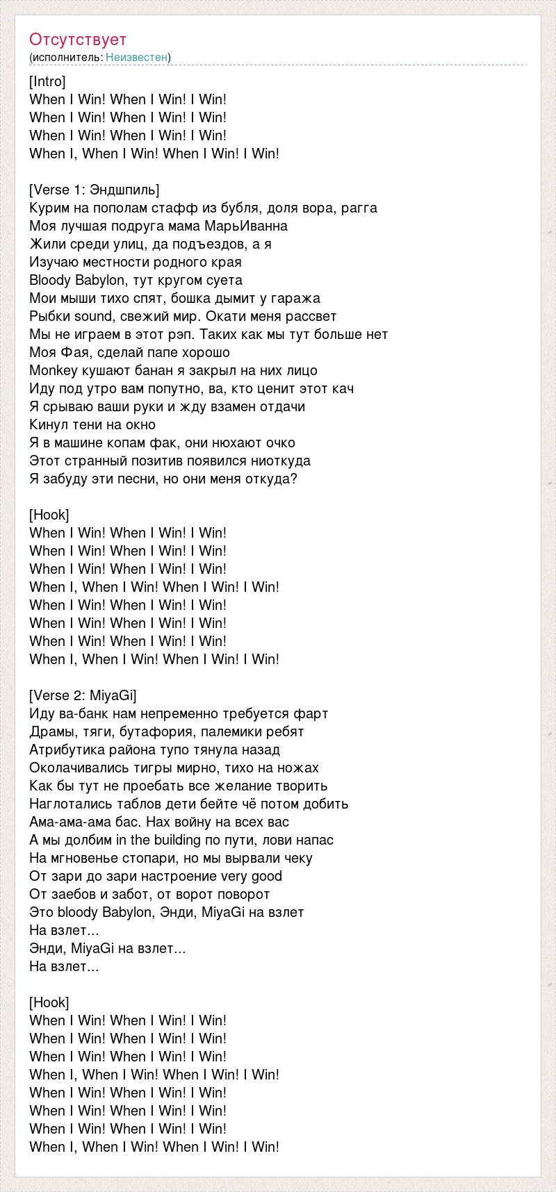 [Intro] When I Win! When I Win! I Win! When I Win! When I Win! I Win! When I Win! When I Win! I Win! When I, When I Win! When I Win! I Win! [Verse 1: Эндшпиль] Курим на пополам стафф из бубля, доля вора, рагга Моя лучшая подруга мама МарьИванна Жили среди улиц, да подъездов, а я Изучаю местности родного края Bloody Babylon, тут кругом суета Мои мыши тихо спят, бошка дымит у гаража Рыбки sound, свежий мир. Окати меня рассвет Мы не играем в этот рэп. Таких как мы тут больше нет Моя Фая, сделай папе хорошо Monkey кушают банан я закрыл на них лицо Иду под утро вам попутно, ва, кто ценит этот кач Я срываю ваши руки и жду взамен отдачи Кинул тени на окно Я в машине копам фак, они нюхают очко Этот странный позитив появился ниоткуда Я забуду эти песни, но они меня откуда? [Hook] When I Win! When I Win! I Win! When I Win! When I Win! I Win! When I Win! When I Win! I Win! When I, When I Win! When I Win! I Win! When I Win! When I Win! I Win! When I Win! When I Win! I Win! When I Win! When I Win! I Win! When I, When I Win! When I Win! I Win! [Verse 2: MiyaGi] Иду ва-банк нам непременно требуется фарт Драмы, тяги, бутафория, палемики ребят Атрибутика района тупо тянула назад Околачивались тигры мирно, тихо на ножах Как бы тут не проебать все желание творить Наглотались таблов дети бейте чё потом добить Ама-ама-ама бас. Нах войну на всех вас А мы долбим in the building по пути, лови напас На мгновенье стопари, но мы вырвали чеку От зари до зари настроение very good От заебов и забот, от ворот поворот Это bloody Babylon, Энди, MiyaGi на взлет На взлет... Энди, MiyaGi на взлет... На взлет... [Hook] When I Win! When I Win! I Win! When I Win! When I Win! I Win! When I Win! When I Win! I Win! When I, When I Win! When I Win! I Win! When I Win! When I Win! I Win! When I Win! When I Win! I Win! When I Win! When I Win! I Win! When I, When I Win! When I Win! I Win!