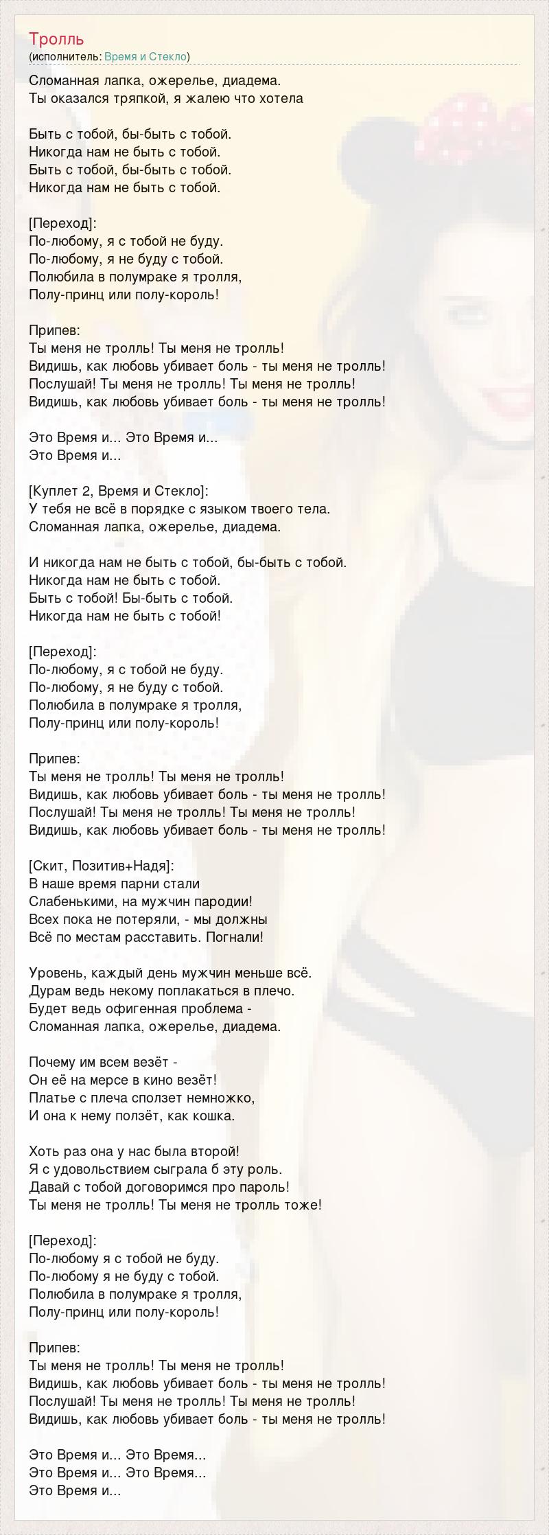 Сломанная лапка, ожерелье, диадема. Ты оказался тряпкой, я жалею что хотела Быть с тобой, бы-быть с тобой. Никогда нам не быть с тобой. Быть с тобой, бы-быть с тобой. Никогда нам не быть с тобой. [Переход]: По-любому, я с тобой не буду. По-любому, я не буду с тобой. Полюбила в полумраке я тролля, Полу-принц или полу-король! Припев: Ты меня не тролль! Ты меня не тролль! Видишь, как любовь убивает боль - ты меня не тролль! Послушай! Ты меня не тролль! Ты меня не тролль! Видишь, как любовь убивает боль - ты меня не тролль! Это Время и... Это Время и... Это Время и... [Куплет 2, Время и Стекло]: У тебя не всё в порядке с языком твоего тела. Сломанная лапка, ожерелье, диадема. И никогда нам не быть с тобой, бы-быть с тобой. Никогда нам не быть с тобой. Быть с тобой! Бы-быть с тобой. Никогда нам не быть с тобой! [Переход]: По-любому, я с тобой не буду. По-любому, я не буду с тобой. Полюбила в полумраке я тролля, Полу-принц или полу-король! Припев: Ты меня не тролль! Ты меня не тролль! Видишь, как любовь убивает боль - ты меня не тролль! Послушай! Ты меня не тролль! Ты меня не тролль! Видишь, как любовь убивает боль - ты меня не тролль! [Скит, Позитив+Надя]: В наше время парни стали Слабенькими, на мужчин пародии! Всех пока не потеряли, - мы должны Всё по местам расставить. Погнали! Уровень, каждый день мужчин меньше всё. Дурам ведь некому поплакаться в плечо. Будет ведь офигенная проблема - Сломанная лапка, ожерелье, диадема. Почему им всем везёт - Он её на мерсе в кино везёт! Платье с плеча сползет немножко, И она к нему ползёт, как кошка. Хоть раз она у нас была второй! Я с удовольствием сыграла б эту роль. Давай с тобой договоримся про пароль! Ты меня не тролль! Ты меня не тролль тоже! [Переход]: По-любому я с тобой не буду. По-любому я не буду с тобой. Полюбила в полумраке я тролля, Полу-принц или полу-король! Припев: Ты меня не тролль! Ты меня не тролль! Видишь, как любовь убивает боль - ты меня не тролль! Послушай! Ты меня не тролль! Ты меня не тролль! Видишь, как любовь убивает боль - ты меня не тролль! Это Время и... Это Время... Это Время и... Это Время... Это Время и...