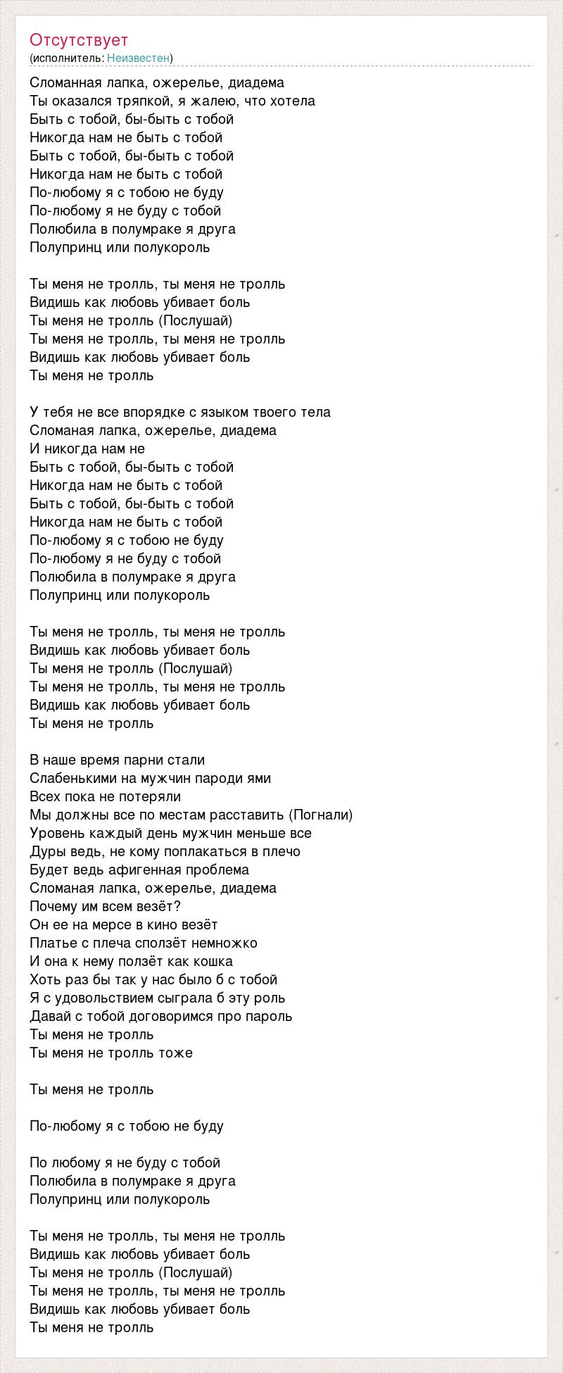 Сломанная лапка, ожерелье, диадема Ты оказался тряпкой, я жалею, что хотела Быть с тобой, бы-быть с тобой Никогда нам не быть с тобой Быть с тобой, бы-быть с тобой Никогда нам не быть с тобой По-любому я с тобою не буду По-любому я не буду с тобой Полюбила в полумраке я друга Полупринц или полукороль Ты меня не тролль, ты меня не тролль Видишь как любовь убивает боль Ты меня не тролль (Послушай) Ты меня не тролль, ты меня не тролль Видишь как любовь убивает боль Ты меня не тролль У тебя не все впорядке с языком твоего тела Сломаная лапка, ожерелье, диадема И никогда нам не Быть с тобой, бы-быть с тобой Никогда нам не быть с тобой Быть с тобой, бы-быть с тобой Никогда нам не быть с тобой По-любому я с тобою не буду По-любому я не буду с тобой Полюбила в полумраке я друга Полупринц или полукороль Ты меня не тролль, ты меня не тролль Видишь как любовь убивает боль Ты меня не тролль (Послушай) Ты меня не тролль, ты меня не тролль Видишь как любовь убивает боль Ты меня не тролль В наше время парни стали Слабенькими на мужчин пароди ями Всех пока не потеряли Мы должны все по местам расставить (Погнали) Уровень каждый день мужчин меньше все Дуры ведь, не кому поплакаться в плечо Будет ведь афигенная проблема Сломаная лапка, ожерелье, диадема Почему им всем везёт? Он ее на мерсе в кино везёт Платье с плеча сползёт немножко И она к нему ползёт как кошка Хоть раз бы так у нас было б с тобой Я с удовольствием сыграла б эту роль Давай с тобой договоримся про пароль Ты меня не тролль Ты меня не тролль тоже Ты меня не тролль По-любому я с тобою не буду По любому я не буду с тобой Полюбила в полумраке я друга Полупринц или полукороль Ты меня не тролль, ты меня не тролль Видишь как любовь убивает боль Ты меня не тролль (Послушай) Ты меня не тролль, ты меня не тролль Видишь как любовь убивает боль Ты меня не тролль