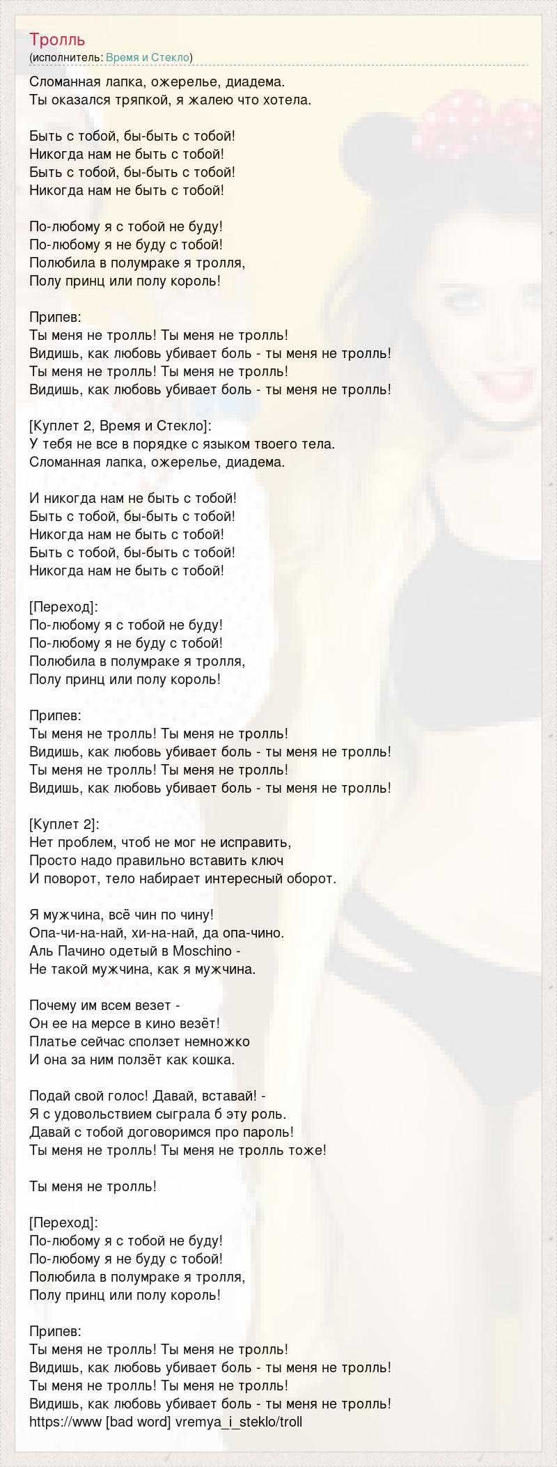 Сломанная лапка, ожерелье, диадема. Ты оказался тряпкой, я жалею что хотела. Быть с тобой, бы-быть с тобой! Никогда нам не быть с тобой! Быть с тобой, бы-быть с тобой! Никогда нам не быть с тобой! По-любому я с тобой не буду! По-любому я не буду с тобой! Полюбила в полумраке я тролля, Полу принц или полу король! Припев: Ты меня не тролль! Ты меня не тролль! Видишь, как любовь убивает боль - ты меня не тролль! Ты меня не тролль! Ты меня не тролль! Видишь, как любовь убивает боль - ты меня не тролль! [Куплет 2, Время и Стекло]: У тебя не все в порядке с языком твоего тела. Сломанная лапка, ожерелье, диадема. И никогда нам не быть с тобой! Быть с тобой, бы-быть с тобой! Никогда нам не быть с тобой! Быть с тобой, бы-быть с тобой! Никогда нам не быть с тобой! [Переход]: По-любому я с тобой не буду! По-любому я не буду с тобой! Полюбила в полумраке я тролля, Полу принц или полу король! Припев: Ты меня не тролль! Ты меня не тролль! Видишь, как любовь убивает боль - ты меня не тролль! Ты меня не тролль! Ты меня не тролль! Видишь, как любовь убивает боль - ты меня не тролль! [Куплет 2]: Нет проблем, чтоб не мог не исправить, Просто надо правильно вставить ключ И поворот, тело набирает интересный оборот. Я мужчина, всё чин по чину! Опа-чи-на-най, xи-на-най, да опа-чино. Аль Пачино одетый в Moschino - Не такой мужчина, как я мужчина. Почему им всем везет - Он ее на мерсе в кино везёт! Платье сейчас сползет немножко И она за ним ползёт как кошка. Подай свой голос! Давай, вставай! - Я с удовольствием сыграла б эту роль. Давай с тобой договоримся про пароль! Ты меня не тролль! Ты меня не тролль тоже! Ты меня не тролль! [Переход]: По-любому я с тобой не буду! По-любому я не буду с тобой! Полюбила в полумраке я тролля, Полу принц или полу король! Припев: Ты меня не тролль! Ты меня не тролль! Видишь, как любовь убивает боль - ты меня не тролль! Ты меня не тролль! Ты меня не тролль! Видишь, как любовь убивает боль - ты меня не тролль! https://www [bad word] vremya_i_steklo/troll