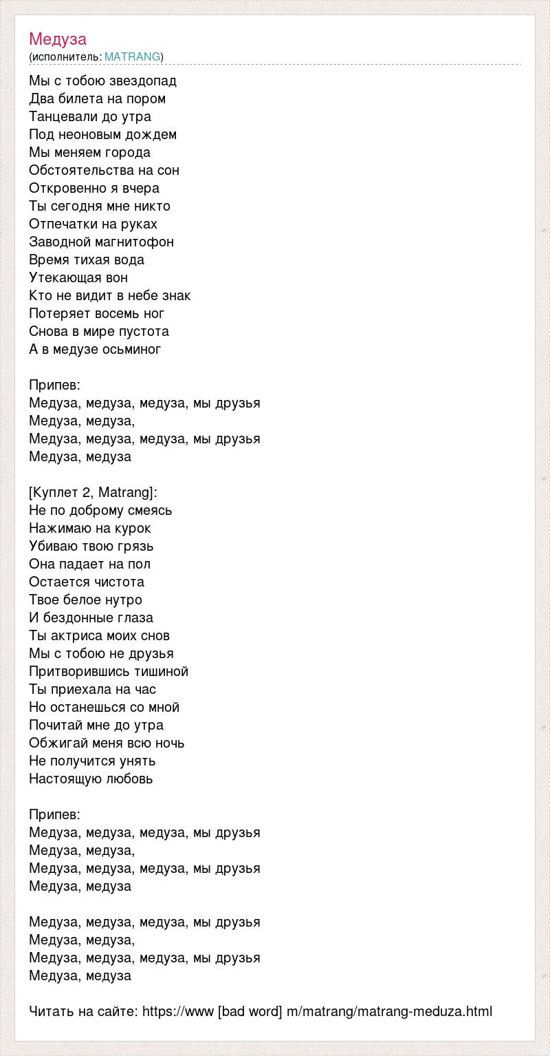 Мы с тобою звездопад Два билета на пором Танцевали до утра Под неоновым дождем Мы меняем города Обстоятельства на сон Откровенно я вчера Ты сегодня мне никто Отпечатки на руках Заводной магнитофон Время тихая вода Утекающая вон Кто не видит в небе знак Потеряет восемь ног Снова в мире пустота А в медузе осьминог Припев: Медуза, медуза, медуза, мы друзья Медуза, медуза, Медуза, медуза, медуза, мы друзья Медуза, медуза [Куплет 2, Matrang]: Не по доброму смеясь Нажимаю на курок Убиваю твою грязь Она падает на пол Остается чистота Твое белое нутро И бездонные глаза Ты актриса моих снов Мы с тобою не друзья Притворившись тишиной Ты приехала на час Но останешься со мной Почитай мне до утра Обжигай меня всю ночь Не получится унять Настоящую любовь Припев: Медуза, медуза, медуза, мы друзья Медуза, медуза, Медуза, медуза, медуза, мы друзья Медуза, медуза Медуза, медуза, медуза, мы друзья Медуза, медуза, Медуза, медуза, медуза, мы друзья Медуза, медуза Читать на сайте: https://www [bad word] m/matrang/matrang-meduza.html