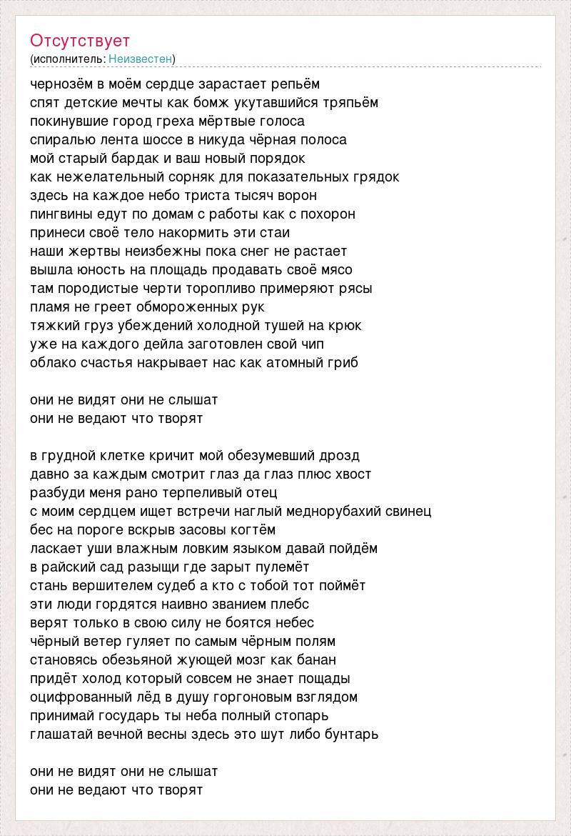 чернозём в моём сердце зарастает репьём спят детские мечты как бомж укутавшийся тряпьём покинувшие город греха мёртвые голоса спиралью лента шоссе в никуда чёрная полоса мой старый бардак и ваш новый порядок как нежелательный сорняк для показательных грядок здесь на каждое небо триста тысяч ворон пингвины едут по домам с работы как с похорон принеси своё тело накормить эти стаи наши жертвы неизбежны пока снег не растает вышла юность на площадь продавать своё мясо там породистые черти торопливо примеряют рясы пламя не греет обмороженных рук тяжкий груз убеждений холодной тушей на крюк уже на каждого дейла заготовлен свой чип облако счастья накрывает нас как атомный гриб они не видят они не слышат они не ведают что творят в грудной клетке кричит мой обезумевший дрозд давно за каждым смотрит глаз да глаз плюс хвост разбуди меня рано терпеливый отец с моим сердцем ищет встречи наглый меднорубахий свинец бес на пороге вскрыв засовы когтём ласкает уши влажным ловким языком давай пойдём в райский сад разыщи где зарыт пулемёт стань вершителем судеб а кто с тобой тот поймёт эти люди гордятся наивно званием плебс верят только в свою силу не боятся небес чёрный ветер гуляет по самым чёрным полям становясь обезьяной жующей мозг как банан придёт холод который совсем не знает пощады оцифрованный лёд в душу горгоновым взглядом принимай государь ты неба полный стопарь глашатай вечной весны здесь это шут либо бунтарь они не видят они не слышат они не ведают что творят