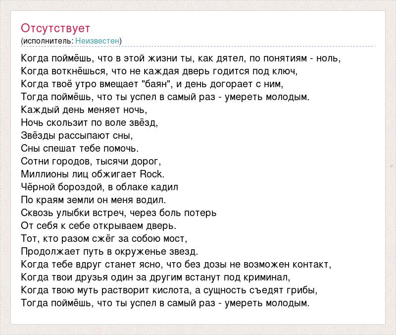 Когда поймёшь, что в этой жизни ты, как дятел, по понятиям - ноль, Когда воткнёшься, что не каждая дверь годится под ключ, Когда твоё утро вмещает "баян", и день догорает с ним, Тогда поймёшь, что ты успел в самый раз - умереть молодым. Каждый день меняет ночь, Ночь скользит по воле звёзд, Звёзды рассыпают сны, Сны спешат тебе помочь. Сотни городов, тысячи дорог, Миллионы лиц обжигает Rock. Чёрной бороздой, в облаке кадил По краям земли он меня водил. Сквозь улыбки встреч, через боль потерь От себя к себе открываем дверь. Тот, кто разом сжёг за собою мост, Продолжает путь в окруженье звезд. Когда тебе вдруг станет ясно, что без дозы не возможен контакт, Когда твои друзья один за другим встанут под криминал, Когда твою муть растворит кислота, а сущность съедят грибы, Тогда поймёшь, что ты успел в самый раз - умереть молодым.