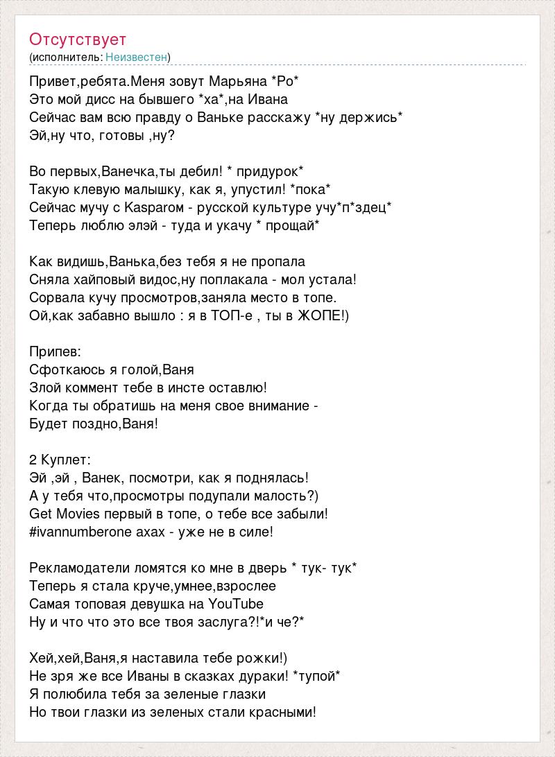 Привет,ребята.Меня зовут Марьяна *Ро* Это мой дисс на бывшего *ха*,на Ивана Сейчас вам всю правду о Ваньке расскажу *ну держись* Эй,ну что, готовы ,ну? Во первых,Ванечка,ты дебил! * придурок* Такую клевую малышку, как я, упустил! *пока* Сейчас мучу с Kasparом - русской культуре учу*п*здец* Теперь люблю элэй - туда и укачу * прощай* Как видишь,Ванька,без тебя я не пропала Сняла хайповый видос,ну поплакала - мол устала! Сорвала кучу просмотров,заняла место в топе. Ой,как забавно вышло : я в ТОП-е , ты в ЖОПЕ!) Припев: Сфоткаюсь я голой,Ваня Злой коммент тебе в инсте оставлю! Когда ты обратишь на меня свое внимание - Будет поздно,Ваня! 2 Куплет: Эй ,эй , Ванек, посмотри, как я поднялась! А у тебя что,просмотры подупали малость?) Get Movies первый в топе, о тебе все забыли! #ivannumberone ахах - уже не в силе! Рекламодатели ломятся ко мне в дверь * тук- тук* Теперь я стала круче,умнее,взрослее Самая топовая девушка на YouTube Ну и что что это все твоя заслуга?!*и че?* Хей,хей,Ваня,я наставила тебе рожки!) Не зря же все Иваны в сказках дураки! *тупой* Я полюбила тебя за зеленые глазки Но твои глазки из зеленых стали красными!