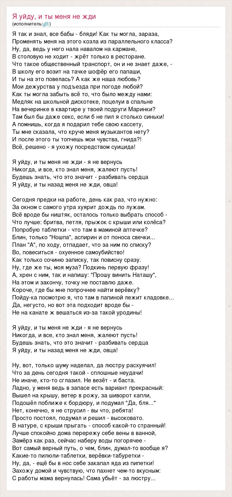 Я так и знал, все бабы - бляди! Как ты могла, зараза, Променять меня на этого козла из параллельного класса? Ну, да, ведь у него нала навалом на кармане, В столовую не ходит - жрёт только в ресторане. Что такое общественный транспорт, он и не знает даже, - В школу его возит на тачке шофёр его папаши, И ты на это повелась? А как же наша любовь? Мои дежурства у подъезда при погоде любой? Как ты могла забыть всё то, что было между нами: Медляк на школьной дискотеке, поцелуи в спальне На вечеринке в квартире у твоей подруги Маринки? Там был бы даже секс, если б не пил я столько синьки! А помнишь, когда я подарил тебе свою кассету, Ты мне сказала, что круче меня музыкантов нету? И после этого ты топчешь мои чувства, гнида?! Всё, решено - я ухожу посредством суицида! Я уйду, и ты меня не жди - я не вернусь Никогда, и все, кто знал меня, жалеют пусть! Будешь знать, что это значит - разбивать сердца Я уйду, и ты назад меня не жди, овца! Сегодня предки на работе, день как раз, что нужно: За окном с самого утра хуярит дождь по лужам. Всё вроде бы ништяк, осталось только выбрать способ - Что лучше: бритва, петля, прыжок с крыши или колёса? Попробую таблетки - что там в маминой аптечке? Блин, только "Ношпа", аспирин и от поноса свечки... План "А", по ходу, отпадает, что за ним по списку? Во, повеситься - охуенное самоубийство! Как только сочиню записку, так повисну сразу. Ну, где же ты, моя муза? Подкинь первую фразу! А, хрен с ним, так и напишу: "Прошу винить Наташу", На этом и закончу, точку не поставлю даже. Короче, где бы мне попрочнее найти верёвку? Пойду-ка посмотрю я, что там в папиной лежит кладовке... Да, негусто, но вот эта подходит вроде бы - Не на канате ж вешаться из-за такой уродины! Я уйду, и ты меня не жди - я не вернусь Никогда, и все, кто знал меня, жалеют пусть! Будешь знать, что это значит - разбивать сердца Я уйду, и ты назад меня не жди, овца! Ну, вот, только шуму наделал, да люстру расхуячил! Что за день сегодня такой - сплошные неудачи! Не иначе, кто-то сглазил. Не везёт - и баста. Ладно, у меня ведь в запасе есть вариант прекрасный: Вышел на крышу, ветер в рожу, за шиворот капли, Подошёл поближе к бордюру, и подумал "Да, бля..." Нет, конечно, я не струсил - вы что, ребята! Просто постоял, подумал и решил - высоковато. В натуре, с крыши прыгать - способ какой-то странный! Лучше спокойно дома перережу себе вены в ванной, Замёрз как раз, сейчас наберу воды погорячее - Вот самый верный путь, о чем, блин, думал-то вообще я? Какие-то пилюли-таблетки, верёвки-табуретки - Ну, да, - ещё бы в нос себе закапал яда из пипетки! Захожу домой и чувствую, что пахнет чем-то вкусным: С работы мама вернулась! Сама убьёт - за люстру...