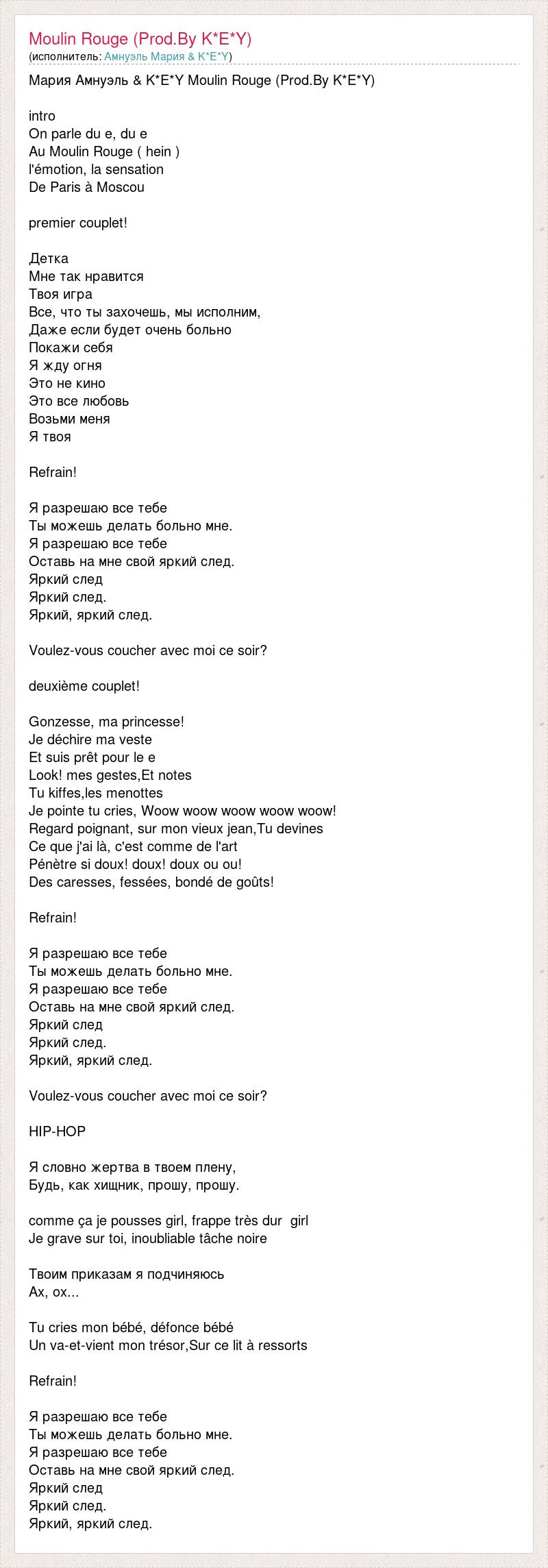 Мария Амнуэль & K*E*Y Moulin Rouge (Prod.By K*E*Y) intro On parle du e, du e Au Moulin Rouge ( hein ) l'émotion, la sensation De Paris à Moscou premier couplet! Детка Мне так нравится Твоя игра Все, что ты захочешь, мы исполним, Даже если будет очень больно Покажи себя Я жду огня Это не кино Это все любовь Возьми меня Я твоя Refrain! Я разрешаю все тебе Ты можешь делать больно мне. Я разрешаю все тебе Оставь на мне свой яркий след. Яркий след Яркий след. Яркий, яркий след. Voulez-vous coucher avec moi ce soir? deuxième couplet! Gonzesse, ma princesse! Je déchire ma veste Et suis prêt pour le e Look! mes gestes,Et notes Tu kiffes,les menottes Je pointe tu cries, Woow woow woow woow woow! Regard poignant, sur mon vieux jean,Tu devines Ce que j'ai là, c'est comme de l'art Pénètre si doux! doux! doux ou ou! Des caresses, fessées, bondé de goûts! Refrain! Я разрешаю все тебе Ты можешь делать больно мне. Я разрешаю все тебе Оставь на мне свой яркий след. Яркий след Яркий след. Яркий, яркий след. Voulez-vous coucher avec moi ce soir? HIP-HOP Я словно жертва в твоем плену, Будь, как хищник, прошу, прошу. comme ça je pousses girl, frappe très dur girl Je grave sur toi, inoubliable tâche noire Твоим приказам я подчиняюсь Ах, ох... Tu cries mon bébé, défonce bébé Un va-et-vient mon trésor,Sur ce lit à ressorts Refrain! Я разрешаю все тебе Ты можешь делать больно мне. Я разрешаю все тебе Оставь на мне свой яркий след. Яркий след Яркий след. Яркий, яркий след.
