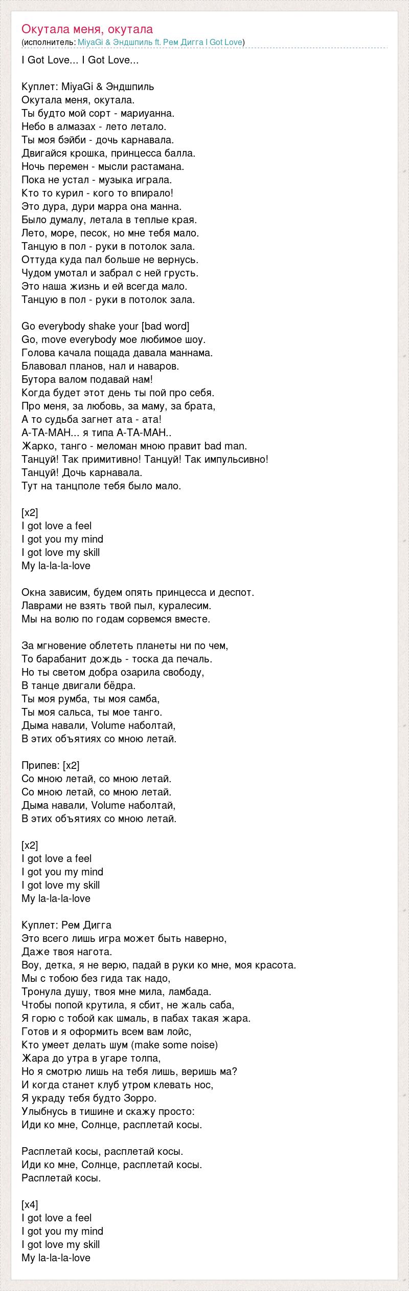 I Got Love... I Got Love... Куплет: MiyaGi & Эндшпиль Окутала меня, окутала. Ты будто мой сорт - мариуанна. Небо в алмазах - лето летало. Ты моя бэйби - дочь карнавала. Двигайся крошка, принцесса балла. Ночь перемен - мысли растамана. Пока не устал - музыка играла. Кто то курил - кого то впирало! Это дура, дури марра она манна. Было думалу, летала в теплые края. Лето, море, песок, но мне тебя мало. Танцую в пол - руки в потолок зала. Оттуда куда пал больше не вернусь. Чудом умотал и забрал с ней грусть. Это наша жизнь и ей всегда мало. Танцую в пол - руки в потолок зала. Go everybody shake your [bad word] Go, move everybody мое любимое шоу. Голова качала пощада давала маннама. Блавовал планов, нал и наваров. Бутора валом подавай нам! Когда будет этот день ты пой про себя. Про меня, за любовь, за маму, за брата, А то судьба загнет ата - ата! А-ТА-МАН... я типа А-ТА-МАН.. Жарко, танго - меломан мною правит bad man. Танцуй! Так примитивно! Танцуй! Так импульсивно! Танцуй! Дочь карнавала. Тут на танцполе тебя было мало. [x2] I got love a feel I got you my mind I got love my skill My la-la-la-love Окна зависим, будем опять принцесса и деспот. Лаврами не взять твой пыл, куралесим. Мы на волю по годам сорвемся вместе. За мгновение облететь планеты ни по чем, То барабанит дождь - тоска да печаль. Но ты светом добра озарила свободу, В танце двигали бёдра. Ты моя румба, ты моя самба, Ты моя сальса, ты мое танго. Дыма навали, Volume наболтай, В этих объятиях со мною летай. Припев: [х2] Со мною летай, со мною летай. Со мною летай, со мною летай. Дыма навали, Volume наболтай, В этих объятиях со мною летай. [х2] I got love a feel I got you my mind I got love my skill My la-la-la-love Куплет: Рем Дигга Это всего лишь игра может быть наверно, Даже твоя нагота. Воу, детка, я не верю, падай в руки ко мне, моя красота. Мы с тобою без гида так надо, Тронула душу, твоя мне мила, ламбада. Чтобы попой крутила, я сбит, не жаль саба, Я горю с тобой как шмаль, в пабах такая жара. Готов и я оформить всем вам лойс, Кто умеет делать шум (make some noise) Жара до утра в угаре толпа, Но я смотрю лишь на тебя лишь, веришь ма? И когда станет клуб утром клевать нос, Я украду тебя будто Зорро. Улыбнусь в тишине и скажу просто: Иди ко мне, Солнце, расплетай косы. Расплетай косы, расплетай косы. Иди ко мне, Солнце, расплетай косы. Расплетай косы. [x4] I got love a feel I got you my mind I got love my skill My la-la-la-love