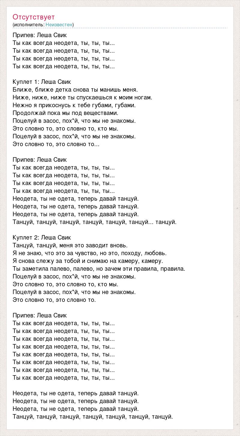 Припев: Леша Свик Ты как всегда неодета, ты, ты, ты... Ты как всегда неодета, ты, ты, ты... Ты как всегда неодета, ты, ты, ты... Ты как всегда неодета, ты, ты, ты... Куплет 1: Леша Свик Ближе, ближе детка снова ты манишь меня. Ниже, ниже, ниже ты спускаешься к моим ногам. Нежно я прикоснусь к тебе губами, губами. Продолжай пока мы под веществами. Поцелуй в засос, пох*й, что мы не знакомы. Это словно то, это словно то, кто мы. Поцелуй в засос, пох*й, что мы не знакомы. Это словно то, это словно то... Припев: Леша Свик Ты как всегда неодета, ты, ты, ты... Ты как всегда неодета, ты, ты, ты... Ты как всегда неодета, ты, ты, ты... Ты как всегда неодета, ты, ты, ты... Неодета, ты не одета, теперь давай танцуй. Неодета, ты не одета, теперь давай танцуй. Неодета, ты не одета, теперь давай танцуй. Танцуй, танцуй, танцуй, танцуй, танцуй, танцуй... танцуй. Куплет 2: Леша Свик Танцуй, танцуй, меня это заводит вновь. Я не знаю, что это за чувство, но это, походу, любовь. Я снова слежу за тобой и снимаю на камеру, камеру. Ты заметила палево, палево, но зачем эти правила, правила. Поцелуй в засос, пох*й, что мы не знакомы. Это словно то, это словно то, кто мы. Поцелуй в засос, пох*й, что мы не знакомы. Это словно то, это словно то. Припев: Леша Свик Ты как всегда неодета, ты, ты, ты... Ты как всегда неодета, ты, ты, ты... Ты как всегда неодета, ты, ты, ты... Ты как всегда неодета, ты, ты, ты... Ты как всегда неодета, ты, ты, ты... Ты как всегда неодета, ты, ты, ты... Ты как всегда неодета, ты, ты, ты... Ты как всегда неодета, ты, ты, ты... Неодета, ты не одета, теперь давай танцуй. Неодета, ты не одета, теперь давай танцуй. Неодета, ты не одета, теперь давай танцуй. Танцуй, танцуй, танцуй, танцуй, танцуй, танцуй, танцуй.