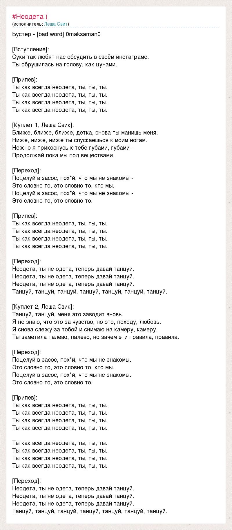 Бустер - [bad word] 0maksaman0 [Вступление]: Cуки так любят нас обсудить в своём инстаграме. Ты обрушилась на голову, как цунами. [Припев]: Ты как всегда неодета, ты, ты, ты. Ты как всегда неодета, ты, ты, ты. Ты как всегда неодета, ты, ты, ты. Ты как всегда неодета, ты, ты, ты. [Куплет 1, Леша Свик]: Ближе, ближе, ближе, детка, снова ты манишь меня. Ниже, ниже, ниже ты спускаешься к моим ногам. Нежно я прикоснусь к тебе губами, губами - Продолжай пока мы под веществами. [Переход]: Поцелуй в засос, пох*й, что мы не знакомы - Это словно то, это словно то, кто мы. Поцелуй в засос, пох*й, что мы не знакомы - Это словно то, это словно то. [Припев]: Ты как всегда неодета, ты, ты, ты. Ты как всегда неодета, ты, ты, ты. Ты как всегда неодета, ты, ты, ты. Ты как всегда неодета, ты, ты, ты. [Переход]: Неодета, ты не одета, теперь давай танцуй. Неодета, ты не одета, теперь давай танцуй. Неодета, ты не одета, теперь давай танцуй. Танцуй, танцуй, танцуй, танцуй, танцуй, танцуй, танцуй. [Куплет 2, Леша Свик]: Танцуй, танцуй, меня это заводит вновь. Я не знаю, что это за чувство, но это, походу, любовь. Я снова слежу за тобой и снимаю на камеру, камеру. Ты заметила палево, палево, но зачем эти правила, правила. [Переход]: Поцелуй в засос, пох*й, что мы не знакомы. Это словно то, это словно то, кто мы. Поцелуй в засос, пох*й, что мы не знакомы. Это словно то, это словно то. [Припев]: Ты как всегда неодета, ты, ты, ты. Ты как всегда неодета, ты, ты, ты. Ты как всегда неодета, ты, ты, ты. Ты как всегда неодета, ты, ты, ты. Ты как всегда неодета, ты, ты, ты. Ты как всегда неодета, ты, ты, ты. Ты как всегда неодета, ты, ты, ты. Ты как всегда неодета, ты, ты, ты. [Переход]: Неодета, ты не одета, теперь давай танцуй. Неодета, ты не одета, теперь давай танцуй. Неодета, ты не одета, теперь давай танцуй. Танцуй, танцуй, танцуй, танцуй, танцуй, танцуй, танцуй.