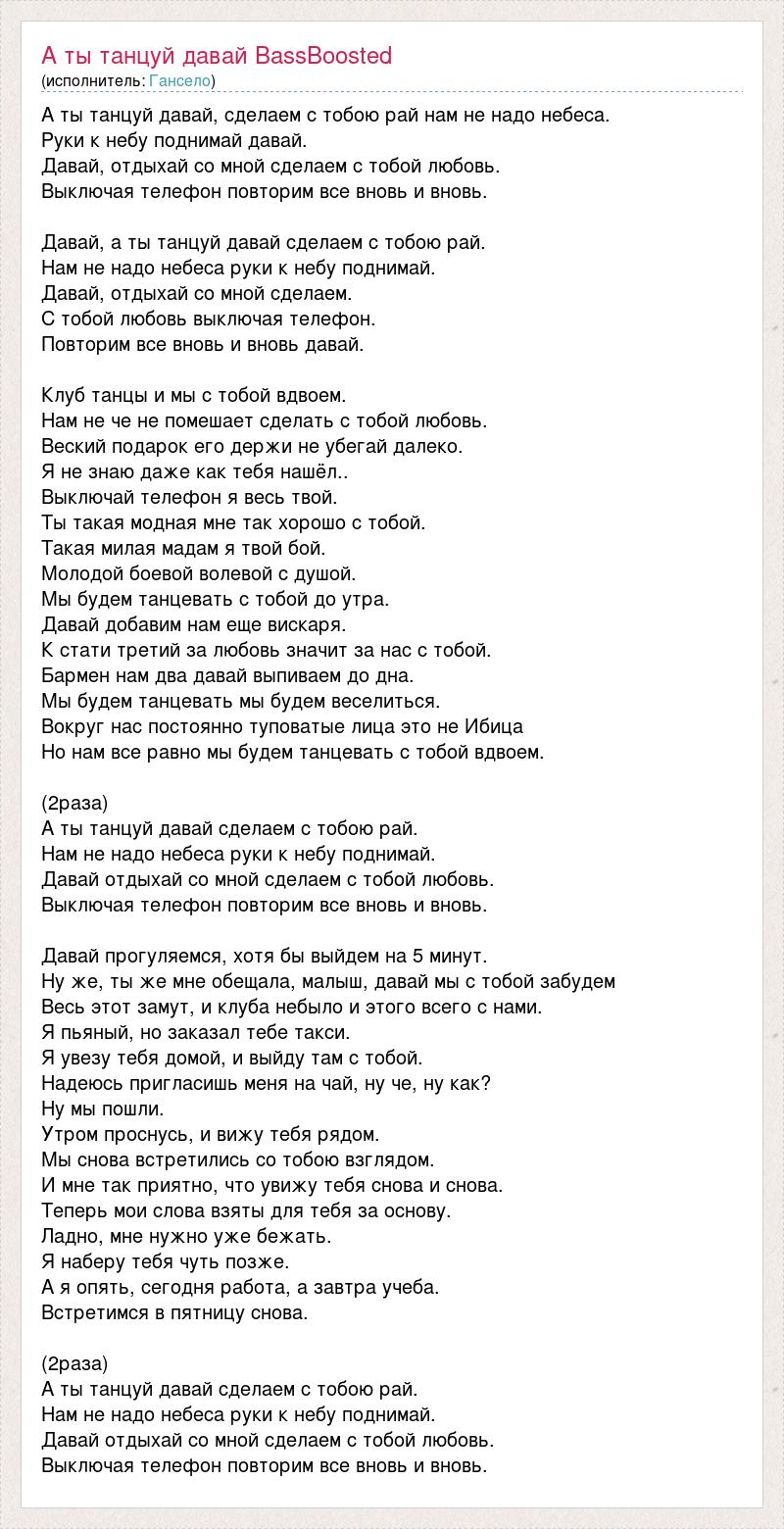 А ты танцуй давай, сделаем с тобою рай нам не надо небеса. Руки к небу поднимай давай. Давай, отдыхай со мной сделаем с тобой любовь. Выключая телефон повторим все вновь и вновь. Давай, а ты танцуй давай сделаем с тобою рай. Нам не надо небеса руки к небу поднимай. Давай, отдыхай со мной сделаем. С тобой любовь выключая телефон. Повторим все вновь и вновь давай. Клуб танцы и мы с тобой вдвоем. Нам не че не помешает сделать с тобой любовь. Веский подарок его держи не убегай далеко. Я не знаю даже как тебя нашёл.. Выключай телефон я весь твой. Ты такая модная мне так хорошо с тобой. Такая милая мадам я твой бой. Молодой боевой волевой с душой. Мы будем танцевать с тобой до утра. Давай добавим нам еще вискаря. К стати третий за любовь значит за нас с тобой. Бармен нам два давай выпиваем до дна. Мы будем танцевать мы будем веселиться. Вокруг нас постоянно туповатые лица это не Ибица Но нам все равно мы будем танцевать с тобой вдвоем. (2раза) А ты танцуй давай сделаем с тобою рай. Нам не надо небеса руки к небу поднимай. Давай отдыхай со мной сделаем с тобой любовь. Выключая телефон повторим все вновь и вновь. Давай прогуляемся, хотя бы выйдем на 5 минут. Ну же, ты же мне обещала, малыш, давай мы с тобой забудем Весь этот замут, и клуба небыло и этого всего с нами. Я пьяный, но заказал тебе такси. Я увезу тебя домой, и выйду там с тобой. Надеюсь пригласишь меня на чай, ну че, ну как? Ну мы пошли. Утром проснусь, и вижу тебя рядом. Мы снова встретились со тобою взглядом. И мне так приятно, что увижу тебя снова и снова. Теперь мои слова взяты для тебя за основу. Ладно, мне нужно уже бежать. Я наберу тебя чуть позже. А я опять, сегодня работа, а завтра учеба. Встретимся в пятницу снова. (2раза) А ты танцуй давай сделаем с тобою рай. Нам не надо небеса руки к небу поднимай. Давай отдыхай со мной сделаем с тобой любовь. Выключая телефон повторим все вновь и вновь.