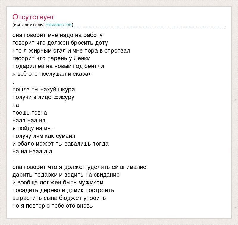 она говорит мне надо на работу говорит что должен бросить доту что я жирным стал и мне пора в спротзал гвоорит что парень у Ленки подарил ей на новый год бентли я всё это послушал и сказал . пошла ты нахуй шкура получи в лицо фисуру на поешь говна нааа наа на я пойду на инт получу лям как сумаил и ебало может ты завалишь тогда на на нааа а а . она говорит что я должен уделять ей внимание дарить подарки и водить на свидание и вообще должен быть мужиком посадить дерево и домик построить вырастить сына бюджет утроить но я повторю тебе это вновь