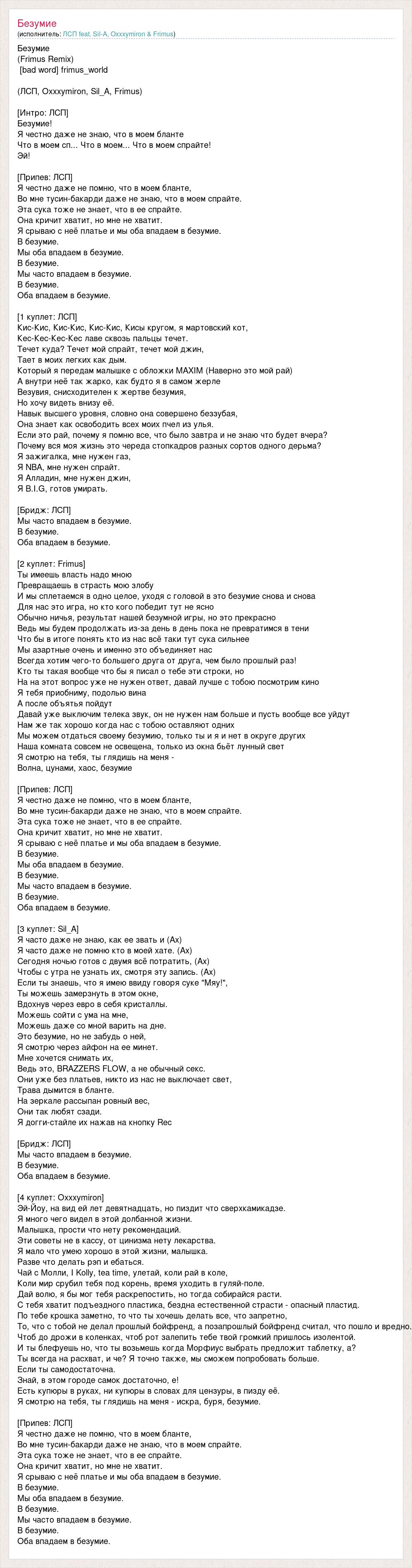 Безумие (Frimus Remix) [bad word] frimus_world (ЛСП, Oxxxymiron, Sil_A, Frimus) [Интро: ЛСП] Безумие! Я честно даже не знаю, что в моем бланте Что в моем сп... Что в моем... Что в моем спрайте! Эй! [Припев: ЛСП] Я честно даже не помню, что в моем бланте, Во мне тусин-бакарди даже не знаю, что в моем спрайте. Эта сука тоже не знает, что в ее спрайте. Она кричит хватит, но мне не хватит. Я срываю с неё платье и мы оба впадаем в безумие. В безумие. Мы оба впадаем в безумие. В безумие. Мы часто впадаем в безумие. В безумие. Оба впадаем в безумие. [1 куплет: ЛСП] Кис-Кис, Кис-Кис, Кис-Кис, Кисы кругом, я мартовский кот, Кес-Кес-Кес-Кес лаве сквозь пальцы течет. Течет куда? Течет мой спрайт, течет мой джин, Тает в моих легких как дым. Который я передам малышке с обложки MAXIM (Наверно это мой рай) А внутри неё так жарко, как будто я в самом жерле Везувия, снисходителен к жертве безумия, Но хочу видеть внизу её. Навык высшего уровня, словно она совершено беззубая, Она знает как освободить всех моих пчел из улья. Если это рай, почему я помню все, что было завтра и не знаю что будет вчера? Почему вся моя жизнь это череда стопкадров разных сортов одного дерьма? Я зажигалка, мне нужен газ, Я NBA, мне нужен спрайт. Я Алладин, мне нужен джин, Я B.I.G, готов умирать. [Бридж: ЛСП] Мы часто впадаем в безумие. В безумие. Оба впадаем в безумие. [2 куплет: Frimus] Ты имеешь власть надо мною Превращаешь в страсть мою злобу И мы сплетаемся в одно целое, уходя с головой в это безумие снова и снова Для нас это игра, но кто кого победит тут не ясно Обычно ничья, результат нашей безумной игры, но это прекрасно Ведь мы будем продолжать из-за день в день пока не превратимся в тени Что бы в итоге понять кто из нас всё таки тут сука сильнее Мы азартные очень и именно это объединяет нас Всегда хотим чего-то большего друга от друга, чем было прошлый раз! Кто ты такая вообще что бы я писал о тебе эти строки, но На на этот вопрос уже не нужен ответ, давай лучше с тобою посмотрим кино Я тебя приобниму, подолью вина А после объятья пойдут Давай уже выключим телека звук, он не нужен нам больше и пусть вообще все уйдут Нам же так хорошо когда нас с тобою оставляют одних Мы можем отдаться своему безумию, только ты и я и нет в округе других Наша комната совсем не освещена, только из окна бьёт лунный свет Я смотрю на тебя, ты глядишь на меня - Волна, цунами, хаос, безумие [Припев: ЛСП] Я честно даже не помню, что в моем бланте, Во мне тусин-бакарди даже не знаю, что в моем спрайте. Эта сука тоже не знает, что в ее спрайте. Она кричит хватит, но мне не хватит. Я срываю с неё платье и мы оба впадаем в безумие. В безумие. Мы оба впадаем в безумие. В безумие. Мы часто впадаем в безумие. В безумие. Оба впадаем в безумие. [3 куплет: Sil_A] Я часто даже не знаю, как ее звать и (Ах) Я часто даже не помню кто в моей хате. (Ах) Сегодня ночью готов с двумя всё потратить, (Ах) Чтобы с утра не узнать их, смотря эту запись. (Ах) Если ты знаешь, что я имею ввиду говоря суке "Мяу!", Ты можешь замерзнуть в этом окне, Вдохнув через евро в себя кристаллы. Можешь сойти с ума на мне, Можешь даже со мной варить на дне. Это безумие, но не забудь о ней, Я смотрю через айфон на ее минет. Мне хочется снимать их, Ведь это, BRAZZERS FLOW, а не обычный секс. Они уже без платьев, никто из нас не выключает свет, Трава дымится в бланте. На зеркале рассыпан ровный вес, Они так любят сзади. Я догги-стайле их нажав на кнопку Rec [Бридж: ЛСП] Мы часто впадаем в