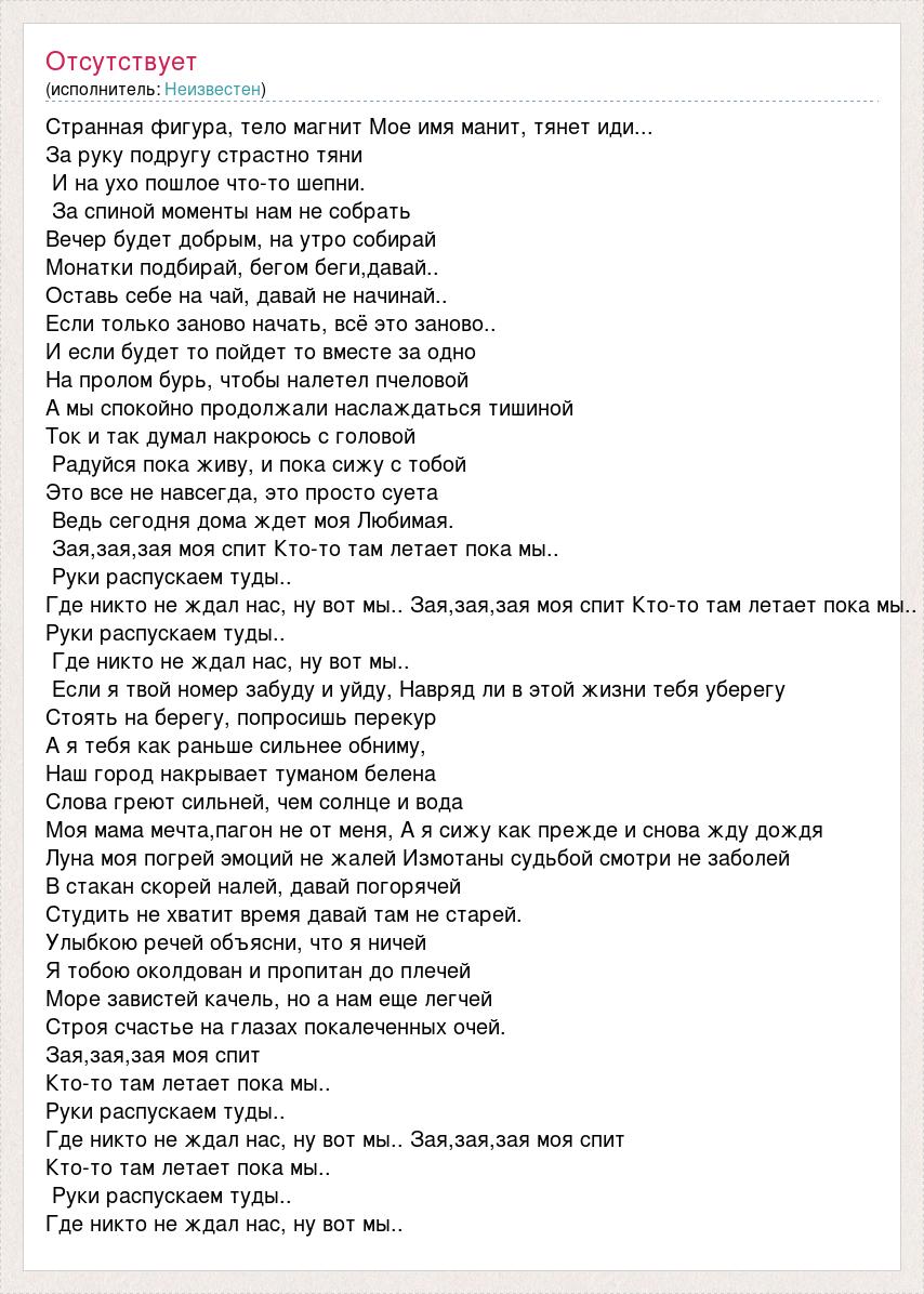 Странная фигура, тело магнит Мое имя манит, тянет иди... За руку подругу страстно тяни И на ухо пошлое что-то шепни. За спиной моменты нам не собрать Вечер будет добрым, на утро собирай Монатки подбирай, бегом беги,давай.. Оставь себе на чай, давай не начинай.. Если только заново начать, всё это заново.. И если будет то пойдет то вместе за одно На пролом бурь, чтобы налетел пчеловой А мы спокойно продолжали наслаждаться тишиной Ток и так думал накроюсь с головой Радуйся пока живу, и пока сижу с тобой Это все не навсегда, это просто суета Ведь сегодня дома ждет моя Любимая. Зая,зая,зая моя спит Кто-то там летает пока мы.. Руки распускаем туды.. Где никто не ждал нас, ну вот мы.. Зая,зая,зая моя спит Кто-то там летает пока мы.. Руки распускаем туды.. Где никто не ждал нас, ну вот мы.. Если я твой номер забуду и уйду, Навряд ли в этой жизни тебя уберегу Стоять на берегу, попросишь перекур А я тебя как раньше сильнее обниму, Наш город накрывает туманом белена Слова греют сильней, чем солнце и вода Моя мама мечта,пагон не от меня, А я сижу как прежде и снова жду дождя Луна моя погрей эмоций не жалей Измотаны судьбой смотри не заболей В стакан скорей налей, давай погорячей Студить не хватит время давай там не старей. Улыбкою речей объясни, что я ничей Я тобою околдован и пропитан до плечей Море завистей качель, но а нам еще легчей Строя счастье на глазах покалеченных очей. Зая,зая,зая моя спит Кто-то там летает пока мы.. Руки распускаем туды.. Где никто не ждал нас, ну вот мы.. Зая,зая,зая моя спит Кто-то там летает пока мы.. Руки распускаем туды.. Где никто не ждал нас, ну вот мы..