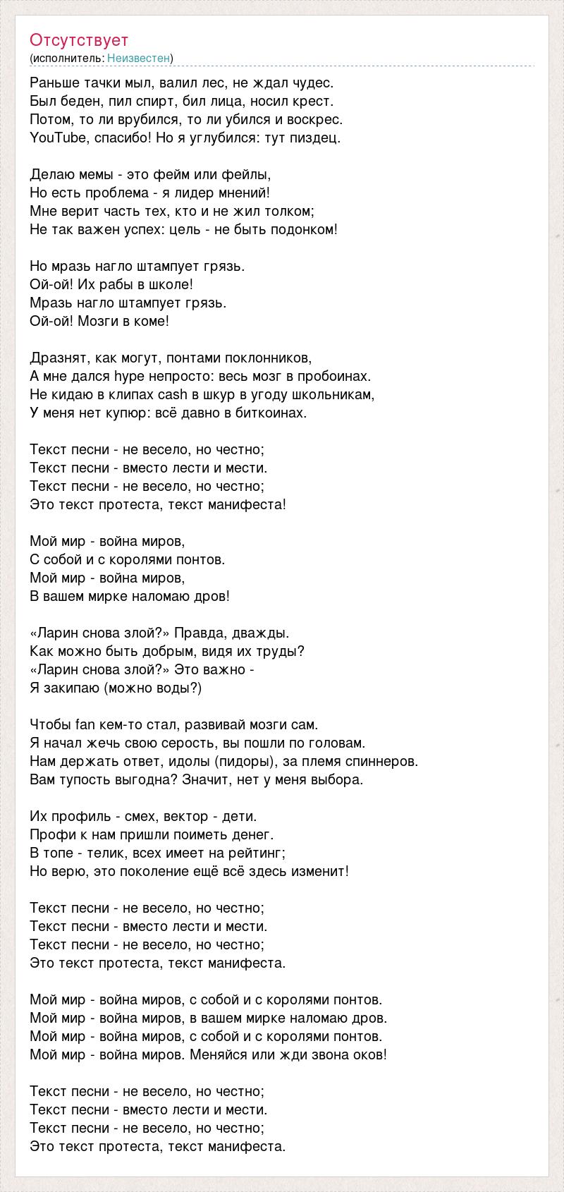 Раньше тачки мыл, валил лес, не ждал чудес. Был беден, пил спирт, бил лица, носил крест. Потом, то ли врубился, то ли убился и воскрес. YouTube, спасибо! Но я углубился: тут пиздец. Делаю мемы - это фейм или фейлы, Но есть проблема - я лидер мнений! Мне верит часть тех, кто и не жил толком; Не так важен успех: цель - не быть подонком! Но мразь нагло штампует грязь. Ой-ой! Их рабы в школе! Мразь нагло штампует грязь. Ой-ой! Мозги в коме! Дразнят, как могут, понтами поклонников, А мне дался hype непросто: весь мозг в пробоинах. Не кидаю в клипах cash в шкур в угоду школьникам, У меня нет купюр: всё давно в биткоинах. Текст песни - не весело, но честно; Текст песни - вместо лести и мести. Текст песни - не весело, но честно; Это текст протеста, текст манифеста! Мой мир - война миров, С собой и с королями понтов. Мой мир - война миров, В вашем мирке наломаю дров! «Ларин снова злой?» Правда, дважды. Как можно быть добрым, видя их труды? «Ларин снова злой?» Это важно - Я закипаю (можно воды?) Чтобы fan кем-то стал, развивай мозги сам. Я начал жечь свою серость, вы пошли по головам. Нам держать ответ, идолы (пидоры), за племя спиннеров. Вам тупость выгодна? Значит, нет у меня выбора. Их профиль - смех, вектор - дети. Профи к нам пришли поиметь денег. В топе - телик, всех имеет на рейтинг; Но верю, это поколение ещё всё здесь изменит! Текст песни - не весело, но честно; Текст песни - вместо лести и мести. Текст песни - не весело, но честно; Это текст протеста, текст манифеста. Мой мир - война миров, с собой и с королями понтов. Мой мир - война миров, в вашем мирке наломаю дров. Мой мир - война миров, с собой и с королями понтов. Мой мир - война миров. Меняйся или жди звона оков! Текст песни - не весело, но честно; Текст песни - вместо лести и мести. Текст песни - не весело, но честно; Это текст протеста, текст манифеста.