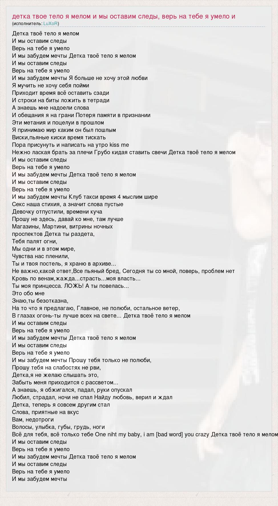 Детка твоё тело я мелом И мы оставим следы Верь на тебе я умело И мы забудем мечты Детка твоё тело я мелом И мы оставим следы Верь на тебе я умело И мы забудем мечты Я больше не хочу этой любви Я мучить не хочу себя пойми Приходит время всё оставить сзади И строки на биты ложить в тетради А знаешь мне надоели слова И обещания я на грани Потеря памяти в признании Эти метания и поцелуи в прошлом Я принимаю мир каким он был пошлым Виски,пьяные киски время тискать Пора присунуть и написать на утро kiss me Нежно лаская брать за плечи Грубо кидая ставить свечи Детка твоё тело я мелом И мы оставим следы Верь на тебе я умело И мы забудем мечты Детка твоё тело я мелом И мы оставим следы Верь на тебе я умело И мы забудем мечты Клуб такси время 4 мыслим шире Секс наша стихия, а значит слова пустые Девочку отпустили, времени куча Прошу не здесь, давай ко мне, там лучше Магазины, Мартини, витрины ночных проспектов Детка ты раздета, Тебя палят огни, Мы одни и в этом мире, Чувства нас пленили, Ты и твоя постель, я храню в архиве... Не важно,какой ответ,Все пьяный бред, Сегодня ты со мной, поверь, проблем нет Кровь по венам,жажда...страсть...моя власть... Ты моя принцесса. ЛОЖЬ! А ты повелась... Это обо мне Знаю,ты безотказна, На то что я предлагаю, Главное, не полюби, остальное ветер, В глазах огонь-ты лучше всех на свете... Детка твоё тело я мелом И мы оставим следы Верь на тебе я умело И мы забудем мечты Детка твоё тело я мелом И мы оставим следы Верь на тебе я умело И мы забудем мечты Прошу тебя только не полюби, Прошу тебя на слабостях не рви, Детка,я не желаю слышать это, Забыть меня приходится с рассветом... А знаешь, я обжигался, падал, руки опускал Любил, страдал, ночи не спал Найду любовь, верил и ждал Детка, теперь я совсем другим стал Слова, приятные на вкус Вам, недотроги Волосы, улыбка, губы, грудь, ноги Всё для тебя, всё только тебе One niht my baby, i am [bad word] you crazy Детка твоё тело я мелом И мы оставим следы Верь на тебе я умело И мы забудем мечты Детка твоё тело я мелом И мы оставим следы Верь на тебе я умело И мы забудем мечты