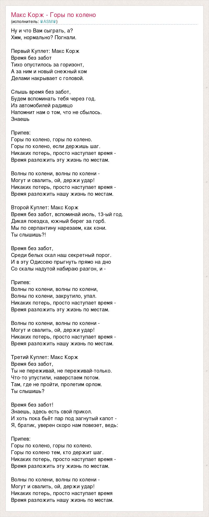 Ну и что Вам сыграть, а? Хмм, нормально? Погнали. Первый Куплет: Макс Корж Время без забот Тихо опустилось за горизонт, А за ним и новый снежный ком Делами накрывает с головой. Слышь время без забот, Будем вспоминать тебя через год. Из автомобилей радивцо Напомнит нам о том, что не сбылось. Знаешь Припев: Горы по колено, горы по колено. Горы по колено, если держишь шаг. Никаких потерь, просто наступает время - Время разложить эту жизнь по местам. Волны по колени, волны по колени - Могут и свалить, ой, держи удар! Никаких потерь, просто наступает время - Время разложить нашу жизнь по местам. Второй Куплет: Макс Корж Время без забот, вспоминай июль, 13-ый год. Дикая поездка, южный берег за горб. Мы по серпантину нарезаем, как кони. Ты слышишь?! Время без забот, Среди белых скал наш секретный порог. И в эту Одиссею прыгнуть прямо на дно Со скалы надутой набираю разгон, и - Припев: Волны по колени, волны по колени, Волны по колени, закрутило, упал. Никаких потерь, просто наступает время - Время разложить эту жизнь по местам. Волны по колени, волны по колени - Могут и свалить, ой, держи удар! Никаких потерь, просто наступает время - Время разложить нашу жизнь по местам. Третий Куплет: Макс Корж Время без забот, Ты не переживай, не переживай-только. Что-то упустили, наверстаем потом. Там, где не пройти, пролетим орлом. Ты слышишь? Время без забот! Знаешь, здесь есть свой прикол. И хоть пока бьёт пар под загнутый капот - Я, братик, уверен скоро нам повезет, ведь: Припев: Горы по колено, горы по колено. Горы по колено тем, кто держит шаг. Никаких потерь, просто наступает время - Время разложить эту жизнь по местам. Волны по колени, волны по колени - Могут и свалить, ой, держи удар! Никаких потерь, просто наступает время Время разложить нашу жизнь по местам.