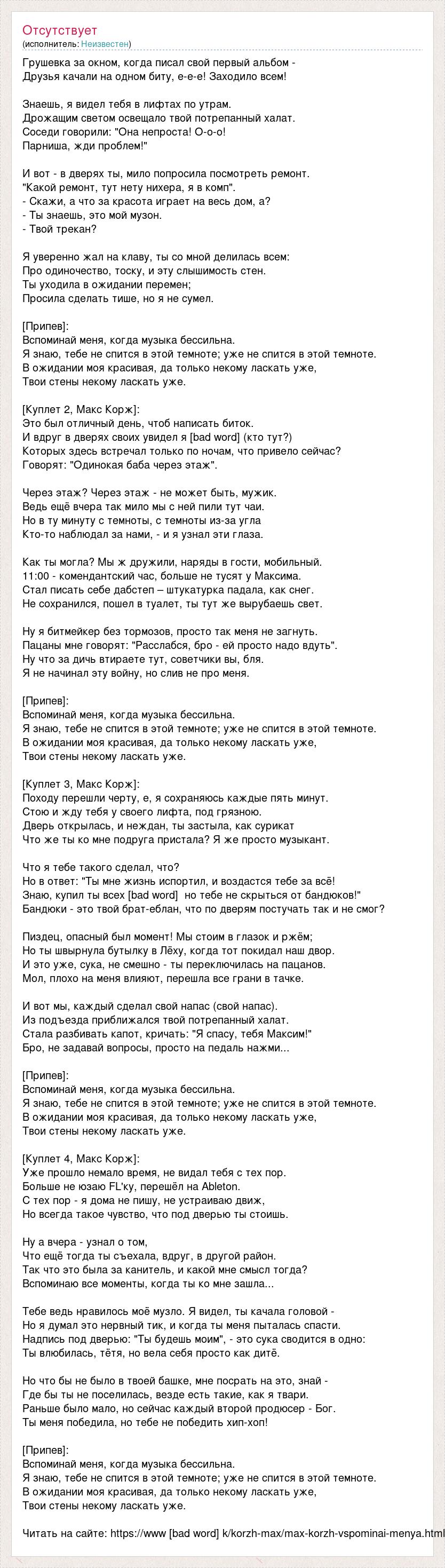 Грушевка за окном, когда писал свой первый альбом - Друзья качали на одном биту, е-е-е! Заходило всем! Знаешь, я видел тебя в лифтах по утрам. Дрожащим светом освещало твой потрепанный халат. Соседи говорили: "Она непроста! О-о-о! Парниша, жди проблем!" И вот - в дверях ты, мило попросила посмотреть ремонт. "Какой ремонт, тут нету нихера, я в комп". - Скажи, а что за красота играет на весь дом, а? - Ты знаешь, это мой музон. - Твой трекан? Я уверенно жал на клаву, ты со мной делилась всем: Про одиночество, тоску, и эту слышимость стен. Ты уходила в ожидании перемен; Просила сделать тише, но я не сумел. [Припев]: Вспоминай меня, когда музыка бессильна. Я знаю, тебе не спится в этой темноте; уже не спится в этой темноте. В ожидании моя красивая, да только некому ласкать уже, Твои стены некому ласкать уже. [Куплет 2, Макс Корж]: Это был отличный день, чтоб написать биток. И вдруг в дверях своих увидел я [bad word] (кто тут?) Которых здесь встречал только по ночам, что привело сейчас? Говорят: "Одинокая баба через этаж". Через этаж? Через этаж - не может быть, мужик. Ведь ещё вчера так мило мы с ней пили тут чаи. Но в ту минуту с темноты, с темноты из-за угла Кто-то наблюдал за нами, - и я узнал эти глаза. Как ты могла? Мы ж дружили, наряды в гости, мобильный. 11:00 - комендантский час, больше не тусят у Максима. Стал писать себе дабстеп – штукатурка падала, как снег. Не сохранился, пошел в туалет, ты тут же вырубаешь свет. Ну я битмейкер без тормозов, просто так меня не загнуть. Пацаны мне говорят: "Расслабся, бро - ей просто надо вдуть". Ну что за дичь втираете тут, советчики вы, бля. Я не начинал эту войну, но слив не про меня. [Припев]: Вспоминай меня, когда музыка бессильна. Я знаю, тебе не спится в этой темноте; уже не спится в этой темноте. В ожидании моя красивая, да только некому ласкать уже, Твои стены некому ласкать уже. [Куплет 3, Макс Корж]: Походу перешли черту, е, я сохраняюсь каждые пять минут. Стою и жду тебя у своего лифта, под грязною. Дверь открылась, и неждан, ты застыла, как сурикат Что же ты ко мне подруга пристала? Я же просто музыкант. Что я тебе такого сделал, что? Но в ответ: "Ты мне жизнь испортил, и воздастся тебе за всё! Знаю, купил ты всех [bad word] но тебе не скрыться от бандюков!" Бандюки - это твой брат-еблан, что по дверям постучать так и не смог? Пиздец, опасный был момент! Мы стоим в глазок и ржём; Но ты швырнула бутылку в Лёху, когда тот покидал наш двор. И это уже, сука, не смешно - ты переключилась на пацанов. Мол, плохо на меня влияют, перешла все грани в тачке. И вот мы, каждый сделал свой напас (свой напас). Из подъезда приближался твой потрепанный халат. Стала разбивать капот, кричать: "Я спасу, тебя Максим!" Бро, не задавай вопросы, просто на педаль нажми... [Припев]: Вспоминай меня, когда музыка бессильна. Я знаю, тебе не спится в этой темноте; уже не спится в этой темноте. В ожидании моя красивая, да только некому ласкать уже, Твои стены некому ласкать уже. [Куплет 4, Макс Корж]: Уже прошло немало время, не видал тебя с тех пор. Больше не юзаю FL'ку, перешёл на Ableton. С тех пор - я дома не пишу, не устраиваю движ, Но всегда такое чувство, что под дверью ты стоишь. Ну а вчера - узнал о том, Что ещё тогда ты съехала, вдруг, в другой район. Так что это была за канитель, и какой мне смысл тогда? Вспоминаю все моменты, когда ты ко мне зашла... Тебе ведь нравилось моё музло. Я видел, ты качала головой - Но я думал это нервный