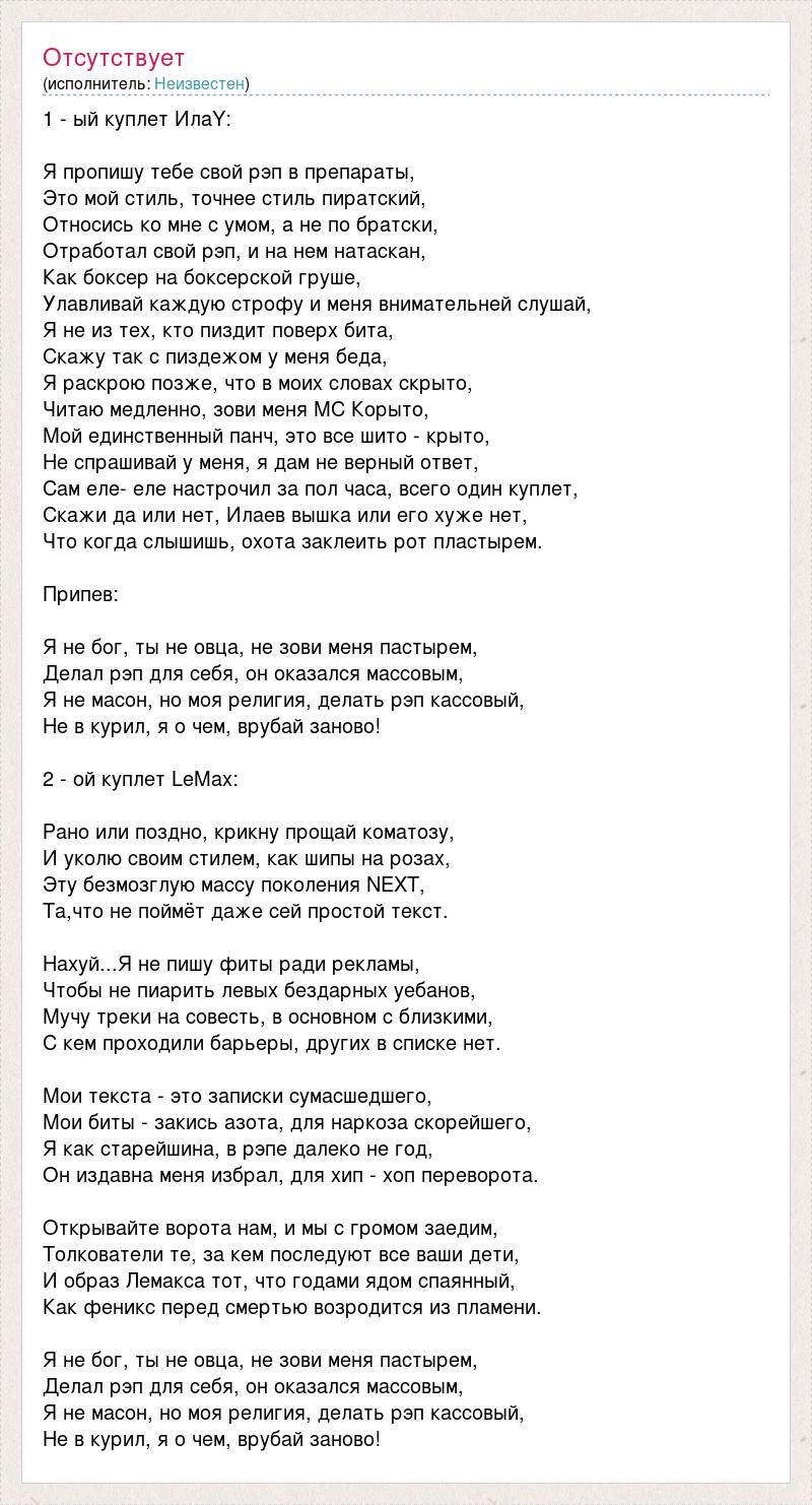 1 - ый куплет ИлаY: Я пропишу тебе свой рэп в препараты, Это мой стиль, точнее стиль пиратский, Относись ко мне с умом, а не по братски, Отработал свой рэп, и на нем натаскан, Как боксер на боксерской груше, Улавливай каждую строфу и меня внимательней слушай, Я не из тех, кто пиздит поверх бита, Скажу так с пиздежом у меня беда, Я раскрою позже, что в моих словах скрыто, Читаю медленно, зови меня МС Корыто, Мой единственный панч, это все шито - крыто, Не спрашивай у меня, я дам не верный ответ, Сам еле- еле настрочил за пол часа, всего один куплет, Скажи да или нет, Илаев вышка или его хуже нет, Что когда слышишь, охота заклеить рот пластырем. Припев: Я не бог, ты не овца, не зови меня пастырем, Делал рэп для себя, он оказался массовым, Я не масон, но моя религия, делать рэп кассовый, Не в курил, я о чем, врубай заново! 2 - ой куплет LeMax: Рано или поздно, крикну прощай коматозу, И уколю своим стилем, как шипы на розах, Эту безмозглую массу поколения NEXT, Та,что не поймёт даже сей простой текст. Нахуй...Я не пишу фиты ради рекламы, Чтобы не пиарить левых бездарных уебанов, Мучу треки на совесть, в основном с близкими, С кем проходили барьеры, других в списке нет. Мои текста - это записки сумасшедшего, Мои биты - закись азота, для наркоза скорейшего, Я как старейшина, в рэпе далеко не год, Он издавна меня избрал, для хип - хоп переворота. Открывайте ворота нам, и мы с громом заедим, Толкователи те, за кем последуют все ваши дети, И образ Лемакса тот, что годами ядом спаянный, Как феникс перед смертью возродится из пламени. Я не бог, ты не овца, не зови меня пастырем, Делал рэп для себя, он оказался массовым, Я не масон, но моя религия, делать рэп кассовый, Не в курил, я о чем, врубай заново!