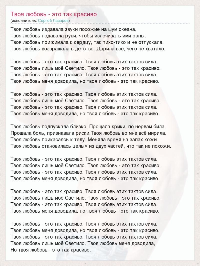 Твоя любовь издавала звуки похожие на шум океана. Твоя любовь подавала руки, чтобы излечивать ими раны. Твоя любовь прижимала к сердцу, так тихо-тихо и не отпускала. Твоя любовь возвращала в детство. Дарила всё, чего не хватало. Твоя любовь - это так красиво. Твоя любовь этих тактов сила. Твоя любовь лишь моё Светило. Твоя любовь - это так красиво. Твоя любовь - это так красиво. Твоя любовь этих тактов сила. Твоя любовь меня доводила, но твоя любовь - это так красиво. Твоя любовь - это так красиво. Твоя любовь этих тактов сила. Твоя любовь лишь моё Светило. Твоя любовь - это так красиво. Твоя любовь - это так красиво. Твоя любовь этих тактов сила. Твоя любовь меня доводила, но твоя любовь - это так красиво. Твоя любовь подпускала близко. Прощала крики, по нервам била. Прощала боль, признавала риски.Твоя любовь во мне всё мирила. Твоя любовь прикасаясь к телу. Меняла время на запах кожи. Твоя любовь становилась целым из двух частей, что так не похожи. Твоя любовь - это так красиво. Твоя любовь этих тактов сила. Твоя любовь лишь моё Светило. Твоя любовь - это так красиво. Твоя любовь - это так красиво. Твоя любовь этих тактов сила. Твоя любовь меня доводила, но твоя любовь - это так красиво. Твоя любовь - это так красиво. Твоя любовь этих тактов сила. Твоя любовь лишь моё Светило. Твоя любовь - это так красиво. Твоя любовь - это так красиво. Твоя любовь этих тактов сила. Твоя любовь меня доводила, но твоя любовь - это так красиво. Твоя любовь - это так красиво. Твоя любовь этих тактов сила. Твоя любовь меня доводила, но твоя любовь - это так красиво. Твоя любовь - это так красиво. Твоя любовь этих тактов сила. Твоя любовь лишь моё Светило. Твоя любовь меня доводила, Но твоя любовь - это так красиво.