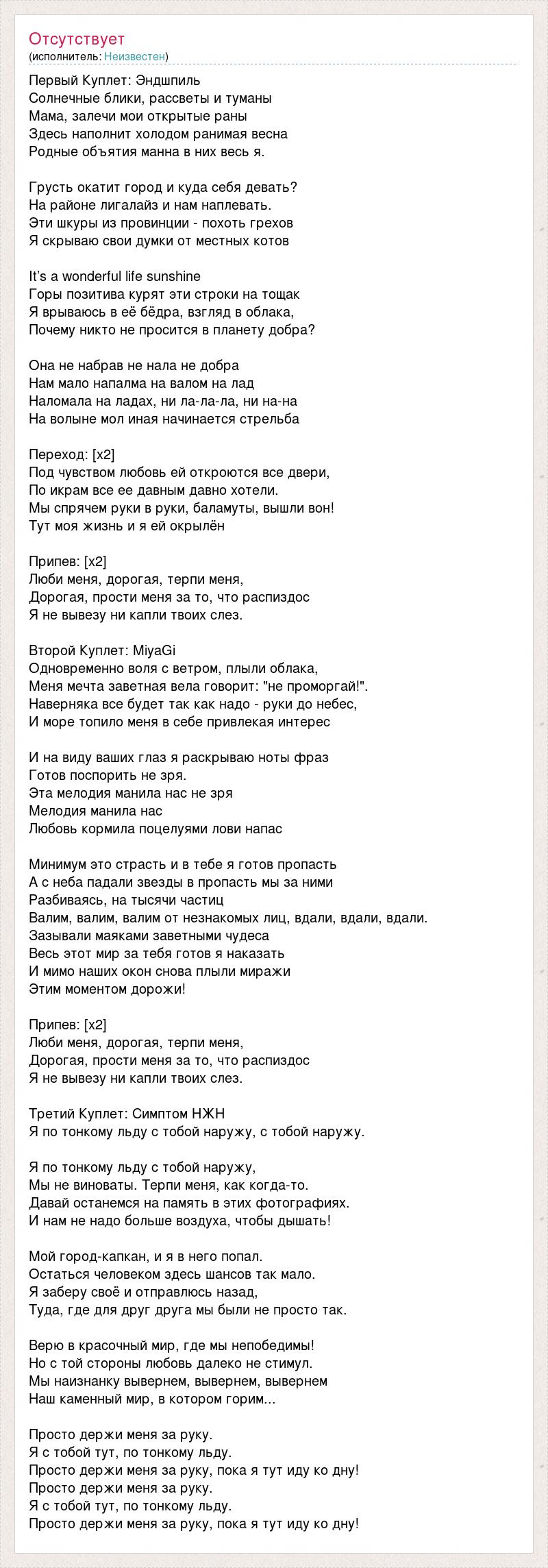 Первый Куплет: Эндшпиль Солнечные блики, рассветы и туманы Мама, залечи мои открытые раны Здесь наполнит холодом ранимая весна Родные объятия манна в них весь я. Грусть окатит город и куда себя девать? На районе лигалайз и нам наплевать. Эти шкуры из провинции - похоть грехов Я скрываю свои думки от местных котов It’s a wonderful life sunshine Горы позитива курят эти строки на тощак Я врываюсь в её бёдра, взгляд в облака, Почему никто не просится в планету добра? Она не набрав не нала не добра Нам мало напалма на валом на лад Наломала на ладах, ни ла-ла-ла, ни на-на На волыне мол иная начинается стрельба Переход: [х2] Под чувством любовь ей откроются все двери, По икрам все ее давным давно хотели. Мы спрячем руки в руки, баламуты, вышли вон! Тут моя жизнь и я ей окрылён Припев: [х2] Люби меня, дорогая, терпи меня, Дорогая, прости меня за то, что распиздос Я не вывезу ни капли твоих слез. Второй Куплет: MiyaGi Одновременно воля с ветром, плыли облака, Меня мечта заветная вела говорит: "не проморгай!". Наверняка все будет так как надо - руки до небес, И море топило меня в себе привлекая интерес И на виду ваших глаз я раскрываю ноты фраз Готов поспорить не зря. Эта мелодия манила нас не зря Мелодия манила нас Любовь кормила поцелуями лови напас Минимум это страсть и в тебе я готов пропасть А с неба падали звезды в пропасть мы за ними Разбиваясь, на тысячи частиц Валим, валим, валим от незнакомых лиц, вдали, вдали, вдали. Зазывали маяками заветными чудеса Весь этот мир за тебя готов я наказать И мимо наших окон снова плыли миражи Этим моментом дорожи! Припев: [х2] Люби меня, дорогая, терпи меня, Дорогая, прости меня за то, что распиздос Я не вывезу ни капли твоих слез. Третий Куплет: Симптом НЖН Я по тонкому льду с тобой наружу, с тобой наружу. Я по тонкому льду с тобой наружу, Мы не виноваты. Терпи меня, как когда-то. Давай останемся на память в этих фотографиях. И нам не надо больше воздуха, чтобы дышать! Мой город-капкан, и я в него попал. Остаться человеком здесь шансов так мало. Я заберу своё и отправлюсь назад, Туда, где для друг друга мы были не просто так. Верю в красочный мир, где мы непобедимы! Но с той стороны любовь далеко не стимул. Мы наизнанку вывернем, вывернем, вывернем Наш каменный мир, в котором горим... Просто держи меня за руку. Я с тобой тут, по тонкому льду. Просто держи меня за руку, пока я тут иду ко дну! Просто держи меня за руку. Я с тобой тут, по тонкому льду. Просто держи меня за руку, пока я тут иду ко дну!