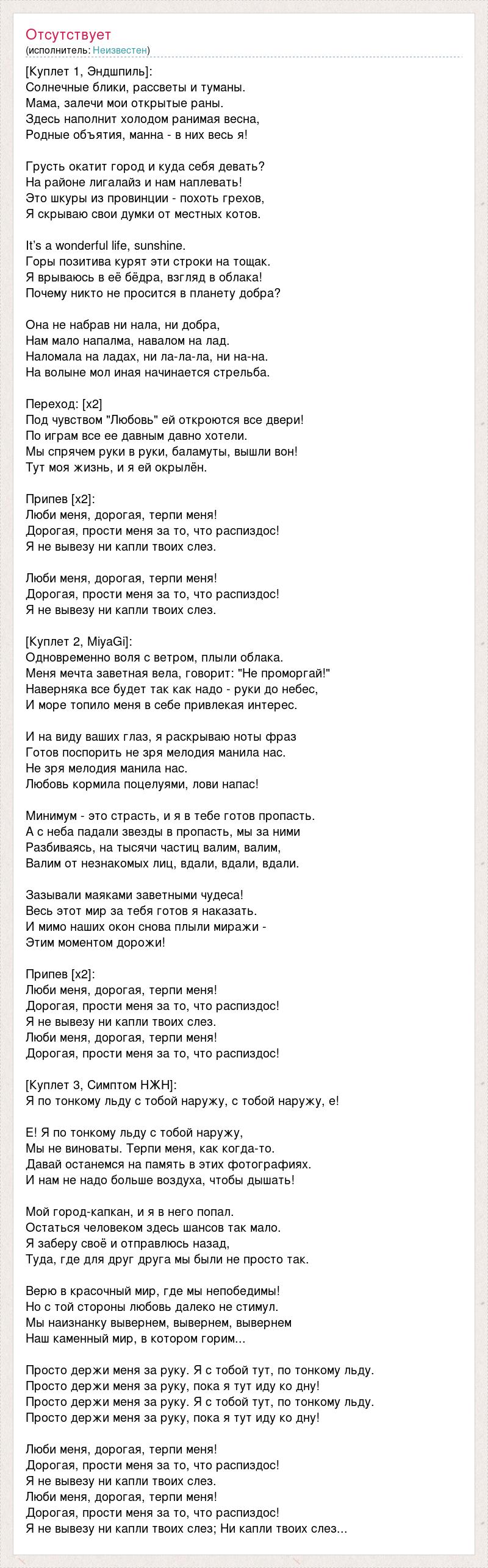 [Куплет 1, Эндшпиль]: Солнечные блики, рассветы и туманы. Мама, залечи мои открытые раны. Здесь наполнит холодом ранимая весна, Родные объятия, манна - в них весь я! Грусть окатит город и куда себя девать? На районе лигалайз и нам наплевать! Это шкуры из провинции - похоть грехов, Я скрываю свои думки от местных котов. It’s a wonderful life, sunshine. Горы позитива курят эти строки на тощак. Я врываюсь в её бёдра, взгляд в облака! Почему никто не просится в планету добра? Она не набрав ни нала, ни добра, Нам мало напалма, навалом на лад. Наломала на ладах, ни ла-ла-ла, ни на-на. На волыне мол иная начинается стрельба. Переход: [х2] Под чувством "Любовь" ей откроются все двери! По играм все ее давным давно хотели. Мы спрячем руки в руки, баламуты, вышли вон! Тут моя жизнь, и я ей окрылён. Припев [х2]: Люби меня, дорогая, терпи меня! Дорогая, прости меня за то, что распиздос! Я не вывезу ни капли твоих слез. Люби меня, дорогая, терпи меня! Дорогая, прости меня за то, что распиздос! Я не вывезу ни капли твоих слез. [Куплет 2, MiyaGi]: Одновременно воля с ветром, плыли облака. Меня мечта заветная вела, говорит: "Не проморгай!" Наверняка все будет так как надо - руки до небес, И море топило меня в себе привлекая интерес. И на виду ваших глаз, я раскрываю ноты фраз Готов поспорить не зря мелодия манила нас. Не зря мелодия манила нас. Любовь кормила поцелуями, лови напас! Минимум - это страсть, и я в тебе готов пропасть. А с неба падали звезды в пропасть, мы за ними Разбиваясь, на тысячи частиц валим, валим, Валим от незнакомых лиц, вдали, вдали, вдали. Зазывали маяками заветными чудеса! Весь этот мир за тебя готов я наказать. И мимо наших окон снова плыли миражи - Этим моментом дорожи! Припев [х2]: Люби меня, дорогая, терпи меня! Дорогая, прости меня за то, что распиздос! Я не вывезу ни капли твоих слез. Люби меня, дорогая, терпи меня! Дорогая, прости меня за то, что распиздос! [Куплет 3, Симптом НЖН]: Я по тонкому льду с тобой наружу, с тобой наружу, е! Е! Я по тонкому льду с тобой наружу, Мы не виноваты. Терпи меня, как когда-то. Давай останемся на память в этих фотографиях. И нам не надо больше воздуха, чтобы дышать! Мой город-капкан, и я в него попал. Остаться человеком здесь шансов так мало. Я заберу своё и отправлюсь назад, Туда, где для друг друга мы были не просто так. Верю в красочный мир, где мы непобедимы! Но с той стороны любовь далеко не стимул. Мы наизнанку вывернем, вывернем, вывернем Наш каменный мир, в котором горим... Просто держи меня за руку. Я с тобой тут, по тонкому льду. Просто держи меня за руку, пока я тут иду ко дну! Просто держи меня за руку. Я с тобой тут, по тонкому льду. Просто держи меня за руку, пока я тут иду ко дну! Люби меня, дорогая, терпи меня! Дорогая, прости меня за то, что распиздос! Я не вывезу ни капли твоих слез. Люби меня, дорогая, терпи меня! Дорогая, прости меня за то, что распиздос! Я не вывезу ни капли твоих слез; Ни капли твоих слез...