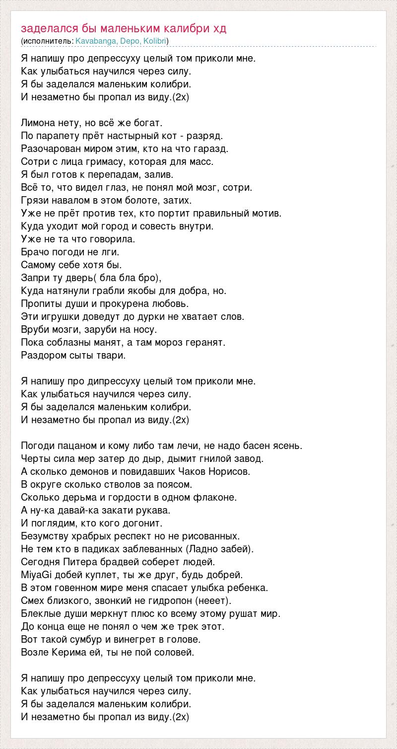 Я напишу про депрессуху целый том приколи мне. Как улыбаться научился через силу. Я бы заделался маленьким колибри. И незаметно бы пропал из виду.(2х) Лимона нету, но всё же богат. По парапету прёт настырный кот - разряд. Разочарован миром этим, кто на что гаразд. Сотри с лица гримасу, которая для масс. Я был готов к перепадам, залив. Всё то, что видел глаз, не понял мой мозг, сотри. Грязи навалом в этом болоте, затих. Уже не прёт против тех, кто портит правильный мотив. Куда уходит мой город и совесть внутри. Уже не та что говорила. Брачо погоди не лги. Самому себе хотя бы. Запри ту дверь( бла бла бро), Куда натянули грабли якобы для добра, но. Пропиты души и прокурена любовь. Эти игрушки доведут до дурки не хватает слов. Вруби мозги, заруби на носу. Пока соблазны манят, а там мороз геранят. Раздором сыты твари. Я напишу про дипрессуху целый том приколи мне. Как улыбаться научился через силу. Я бы заделался маленьким колибри. И незаметно бы пропал из виду.(2х) Погоди пацаном и кому либо там лечи, не надо басен ясень. Черты сила мер затер до дыр, дымит гнилой завод. А сколько демонов и повидавших Чаков Норисов. В округе сколько стволов за поясом. Сколько дерьма и гордости в одном флаконе. А ну-ка давай-ка закати рукава. И поглядим, кто кого догонит. Безумству храбрых респект но не рисованных. Не тем кто в падиках заблеванных (Ладно забей). Сегодня Питера брадвей соберет людей. MiyaGi добей куплет, ты же друг, будь добрей. В этом говенном мире меня спасает улыбка ребенка. Смех близкого, звонкий не гидропон (нееет). Блеклые души меркнут плюс ко всему этому рушат мир. До конца еще не понял о чем же трек этот. Вот такой сумбур и винегрет в голове. Возле Керима ей, ты не пой соловей. Я напишу про депрессуху целый том приколи мне. Как улыбаться научился через силу. Я бы заделался маленьким колибри. И незаметно бы пропал из виду.(2х)