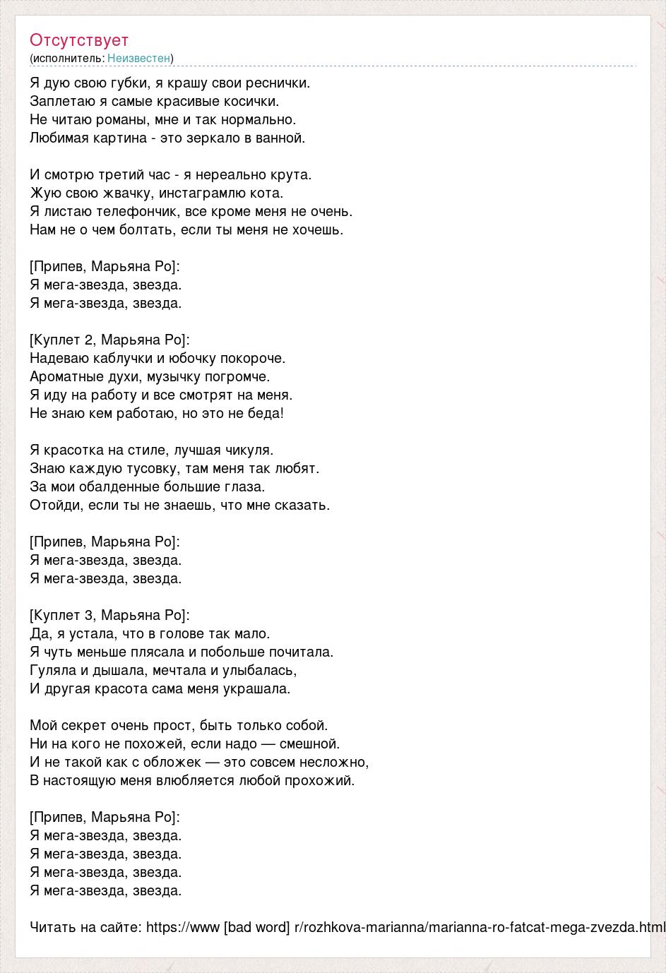 Я дую свою губки, я крашу свои реснички. Заплетаю я самые красивые косички. Не читаю романы, мне и так нормально. Любимая картина - это зеркало в ванной. И смотрю третий час - я нереально крута. Жую свою жвачку, инстаграмлю кота. Я листаю телефончик, все кроме меня не очень. Нам не о чем болтать, если ты меня не хочешь. [Припев, Марьяна Ро]: Я мега-звезда, звезда. Я мега-звезда, звезда. [Куплет 2, Марьяна Ро]: Надеваю каблучки и юбочку покороче. Ароматные духи, музычку погромче. Я иду на работу и все смотрят на меня. Не знаю кем работаю, но это не беда! Я красотка на стиле, лучшая чикуля. Знаю каждую тусовку, там меня так любят. За мои обалденные большие глаза. Отойди, если ты не знаешь, что мне сказать. [Припев, Марьяна Ро]: Я мега-звезда, звезда. Я мега-звезда, звезда. [Куплет 3, Марьяна Ро]: Да, я устала, что в голове так мало. Я чуть меньше плясала и побольше почитала. Гуляла и дышала, мечтала и улыбалась, И другая красота сама меня украшала. Мой секрет очень прост, быть только собой. Ни на кого не похожей, если надо — смешной. И не такой как с обложек — это совсем несложно, В настоящую меня влюбляется любой прохожий. [Припев, Марьяна Ро]: Я мега-звезда, звезда. Я мега-звезда, звезда. Я мега-звезда, звезда. Я мега-звезда, звезда. Читать на сайте: https://www [bad word] r/rozhkova-marianna/marianna-ro-fatcat-mega-zvezda.html
