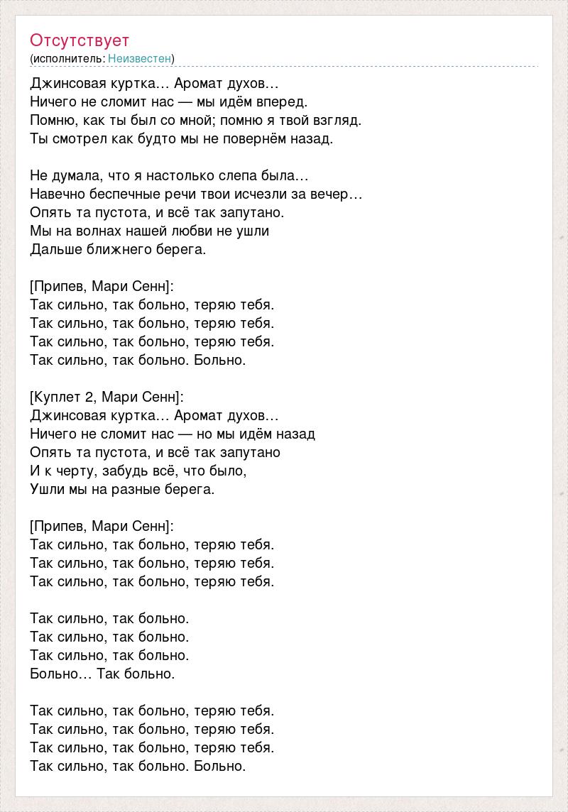 Джинсовая куртка… Аромат духов… Ничего не сломит нас — мы идём вперед. Помню, как ты был со мной; помню я твой взгляд. Ты смотрел как будто мы не повернём назад. Не думала, что я настолько слепа была… Навечно беспечные речи твои исчезли за вечер… Опять та пустота, и всё так запутано. Мы на волнах нашей любви не ушли Дальше ближнего берега. [Припев, Мари Сенн]: Так сильно, так больно, теряю тебя. Так сильно, так больно, теряю тебя. Так сильно, так больно, теряю тебя. Так сильно, так больно. Больно. [Куплет 2, Мари Сенн]: Джинсовая куртка… Аромат духов… Ничего не сломит нас — но мы идём назад Опять та пустота, и всё так запутано И к черту, забудь всё, что было, Ушли мы на разные берега. [Припев, Мари Сенн]: Так сильно, так больно, теряю тебя. Так сильно, так больно, теряю тебя. Так сильно, так больно, теряю тебя. Так сильно, так больно. Так сильно, так больно. Так сильно, так больно. Больно… Так больно. Так сильно, так больно, теряю тебя. Так сильно, так больно, теряю тебя. Так сильно, так больно, теряю тебя. Так сильно, так больно. Больно.