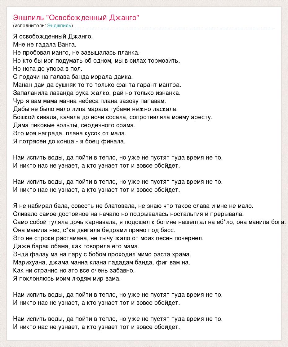 Я освобожденный Джанго. Мне не гадала Ванга. Не пробовал манго, не завышалась планка. Но кто бы мог подумать об одном, мы в силах тормозить. Но нога до упора в пол. С подачи на галава банда морала дамка. Манан дам да сушняк то то только фанта гарант мантра. Запаланила лаванда рука жалко, рай но только изнанка. Чур я вам мама манна небеса плана зазову папавам. Дабы не было мало липа марала губами нежно ласкала. Бошкой кивала, качала до ночи сосала, сопротивляла моему аресту. Дама пиковые вольты, сердечного срама. Это моя награда, плана кусок от мала. Я потрясен до конца - я боец финала. Нам испить воды, да пойти в тепло, но уже не пустят туда время не то. И никто нас не узнает, а кто узнает тот и вовсе обойдет. Нам испить воды, да пойти в тепло, но уже не пустят туда время не то. И никто нас не узнает, а кто узнает тот и вовсе обойдет. Я не набирал бала, совесть не блатовала, не знаю что такое слава и мне не мало. Сливало самое достойное на начало но подрывалась ностальгия и прерывала. Само собой гуляла дочь карнавала, я подошел к богине нашептал на еб*ло, она манила бога. Она манила нас, с*ка двигала бедрами прямо под басс. Это не строки растамана, не тычу жало от моих песен почернел. Даже барак обама, как говорила его мама. Энди фалау ма на пару с бобом проходил мимо раста храма. Марихуана, джама манна клана пададам банда, фиг вам на. Как ни странно но это все очень забавно. Я поклоняюсь моим людям мир вама. Нам испить воды, да пойти в тепло, но уже не пустят туда время не то. И никто нас не узнает, а кто узнает тот и вовсе обойдет. Нам испить воды, да пойти в тепло, но уже не пустят туда время не то. И никто нас не узнает, а кто узнает тот и вовсе обойдет.