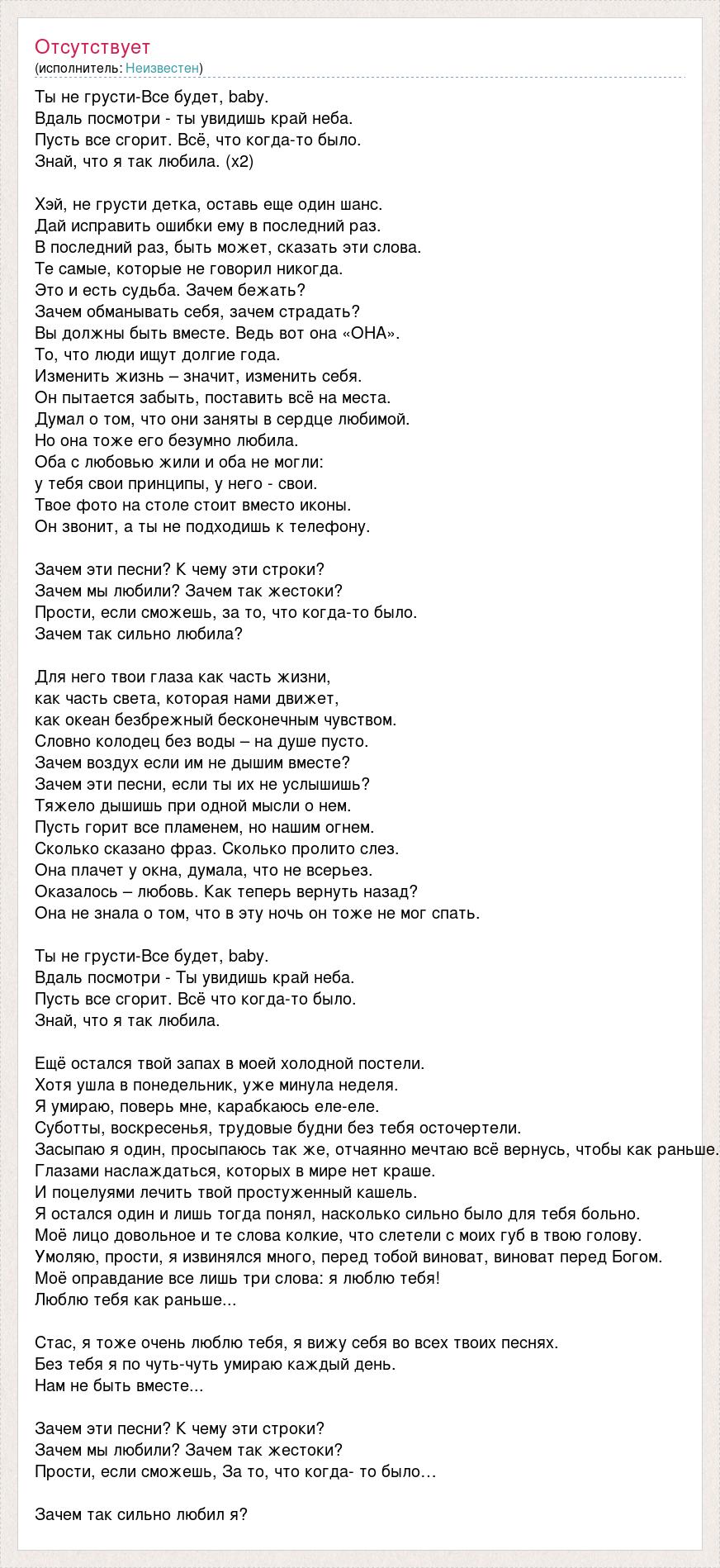 Ты не грусти-Все будет, baby. Вдаль посмотри - ты увидишь край неба. Пусть все сгорит. Всё, что когда-то было. Знай, что я так любила. (x2) Хэй, не грусти детка, оставь еще один шанс. Дай исправить ошибки ему в последний раз. В последний раз, быть может, сказать эти слова. Те самые, которые не говорил никогда. Это и есть судьба. Зачем бежать? Зачем обманывать себя, зачем страдать? Вы должны быть вместе. Ведь вот она «ОНА». То, что люди ищут долгие года. Изменить жизнь – значит, изменить себя. Он пытается забыть, поставить всё на места. Думал о том, что они заняты в сердце любимой. Но она тоже его безумно любила. Оба с любовью жили и оба не могли: у тебя свои принципы, у него - свои. Твое фото на столе стоит вместо иконы. Он звонит, а ты не подходишь к телефону. Зачем эти песни? К чему эти строки? Зачем мы любили? Зачем так жестоки? Прости, если сможешь, за то, что когда-то было. Зачем так сильно любила? Для него твои глаза как часть жизни, как часть света, которая нами движет, как океан безбрежный бесконечным чувством. Словно колодец без воды – на душе пусто. Зачем воздух если им не дышим вместе? Зачем эти песни, если ты их не услышишь? Тяжело дышишь при одной мысли о нем. Пусть горит все пламенем, но нашим огнем. Сколько сказано фраз. Сколько пролито слез. Она плачет у окна, думала, что не всерьез. Оказалось – любовь. Как теперь вернуть назад? Она не знала о том, что в эту ночь он тоже не мог спать. Ты не грусти-Все будет, baby. Вдаль посмотри - Ты увидишь край неба. Пусть все сгорит. Всё что когда-то было. Знай, что я так любила. Ещё остался твой запах в моей холодной постели. Хотя ушла в понедельник, уже минула неделя. Я умираю, поверь мне, карабкаюсь еле-еле. Суботты, воскресенья, трудовые будни без тебя осточертели. Засыпаю я один, просыпаюсь так же, отчаянно мечтаю всё вернусь, чтобы как раньше. Глазами наслаждаться, которых в мире нет краше. И поцелуями лечить твой простуженный кашель. Я остался один и лишь тогда понял, насколько сильно было для тебя больно. Моё лицо довольное и те слова колкие, что слетели с моих губ в твою голову. Умоляю, прости, я извинялся много, перед тобой виноват, виноват перед Богом. Моё оправдание все лишь три слова: я люблю тебя! Люблю тебя как раньше... Стас, я тоже очень люблю тебя, я вижу себя во всех твоих песнях. Без тебя я по чуть-чуть умираю каждый день. Нам не быть вместе... Зачем эти песни? К чему эти строки? Зачем мы любили? Зачем так жестоки? Прости, если сможешь, За то, что когда- то было… Зачем так сильно любил я?
