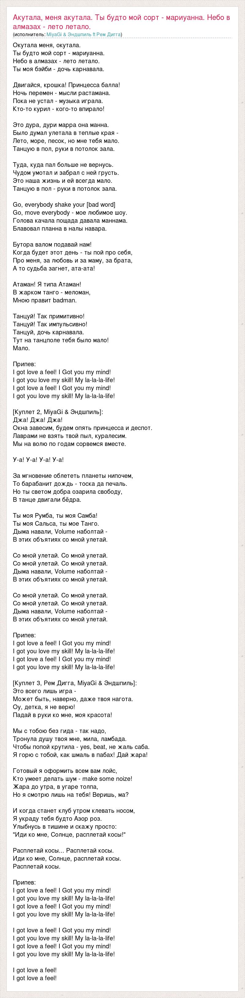 Окутала меня, окутала. Ты будто мой сорт - мариуанна. Небо в алмазах - лето летало. Ты моя бэйби - дочь карнавала. Двигайся, крошка! Принцесса балла! Ночь перемен - мысли растамана. Пока не устал - музыка играла. Кто-то курил - кого-то впирало! Это дура, дури марра она манна. Было думал улетала в теплые края - Лето, море, песок, но мне тебя мало. Танцую в пол, руки в потолок зала. Туда, куда пал больше не вернусь. Чудом умотал и забрал с ней грусть. Это наша жизнь и ей всегда мало. Танцую в пол - руки в потолок зала. Go, everybody shake your [bad word] Go, move everybody - мое любимое шоу. Голова качала пощада давала маннама. Блавовал планна в налы навара. Бутора валом подавай нам! Когда будет этот день - ты пой про себя, Про меня, за любовь и за маму, за брата, А то судьба загнет, ата-ата! Атаман! Я типа Атаман! В жарком танго - меломан, Мною правит badman. Танцуй! Так примитивно! Танцуй! Так импульсивно! Танцуй, дочь карнавала. Тут на танцполе тебя было мало! Мало. Припев: I got love a feel! I Got you my mind! I got you love my skill! My la-la-la-life! I got love a feel! I Got you my mind! I got you love my skill! My la-la-la-life! [Куплет 2, MiyaGi & Эндшпиль]: Джа! Джа! Джа! Окна завесим, будем опять принцесса и деспот. Лаврами не взять твой пыл, куралесим. Мы на волю по годам сорвемся вместе. У-а! У-а! У-а! У-а! За мгновение облететь планеты нипочем, То барабанит дождь - тоска да печаль. Но ты светом добра озарила свободу, В танце двигали бёдра. Ты моя Румба, ты моя Самба! Ты моя Сальса, ты мое Танго. Дыма навали, Volume наболтай - В этих объятиях со мной улетай. Со мной улетай. Со мной улетай. Со мной улетай. Со мной улетай. Дыма навали, Volume наболтай - В этих объятиях со мной улетай. Со мной улетай. Со мной улетай. Со мной улетай. Со мной улетай. Дыма навали, Volume наболтай - В этих объятиях со мной улетай. Припев: I got love a feel! I Got you my mind! I got you love my skill! My la-la-la-life! I got love a feel! I Got you my mind! I got you love my skill! My la-la-la-life! [Куплет 3, Рем Дигга, MiyaGi & Эндшпиль]: Это всего лишь игра - Может быть, наверно, даже твоя нагота. Оу, детка, я не верю! Падай в руки ко мне, моя красота! Мы с тобою без гида - так надо, Тронула душу твоя мне, мила, ламбада. Чтобы попой крутила - yes, beat, не жаль саба. Я горю с тобой, как шмаль в пабах! Дай жара! Готовый я оформить всем вам лойс, Кто умеет делать шум - make some noize! Жара до утра, в угаре толпа, Но я смотрю лишь на тебя! Веришь, ма? И когда станет клуб утром клевать носом, Я украду тебя будто Азор роз. Улыбнусь в тишине и скажу просто: "Иди ко мне, Солнце, расплетай косы!" Расплетай косы... Расплетай косы. Иди ко мне, Солнце, расплетай косы. Расплетай косы. Припев: I got love a feel! I Got you my mind! I got you love my skill! My la-la-la-life! I got love a feel! I Got you my mind! I got you love my skill! My la-la-la-life! I got love a feel! I Got you my mind! I got you love my skill! My la-la-la-life! I got love a feel! I Got you my mind! I got you love my skill! My la-la-la-life! I got love a feel! I got love a feel!