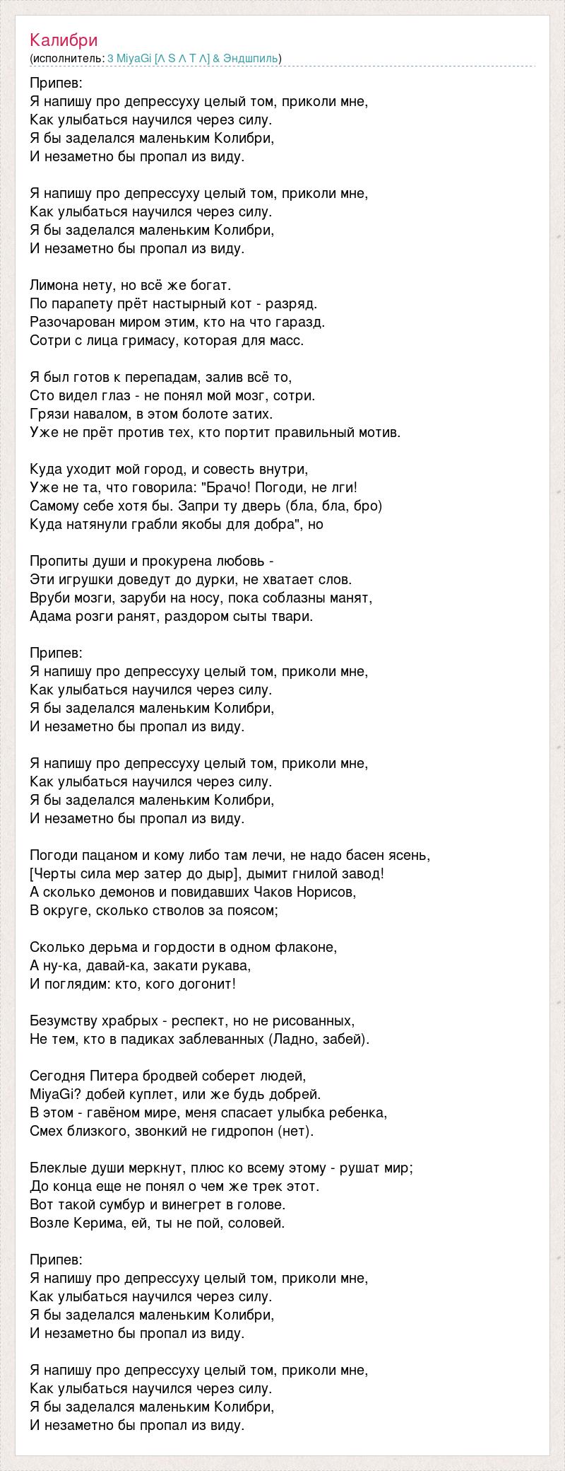 Припев: Я напишу про депрессуху целый том, приколи мне, Как улыбаться научился через силу. Я бы заделался маленьким Колибри, И незаметно бы пропал из виду. Я напишу про депрессуху целый том, приколи мне, Как улыбаться научился через силу. Я бы заделался маленьким Колибри, И незаметно бы пропал из виду. Лимона нету, но всё же богат. По парапету прёт настырный кот - разряд. Разочарован миром этим, кто на что гаразд. Сотри с лица гримасу, которая для масс. Я был готов к перепадам, залив всё то, Сто видел глаз - не понял мой мозг, сотри. Грязи навалом, в этом болоте затих. Уже не прёт против тех, кто портит правильный мотив. Куда уходит мой город, и совесть внутри, Уже не та, что говорила: "Брачо! Погоди, не лги! Самому себе хотя бы. Запри ту дверь (бла, бла, бро) Куда натянули грабли якобы для добра", но Пропиты души и прокурена любовь - Эти игрушки доведут до дурки, не хватает слов. Вруби мозги, заруби на носу, пока соблазны манят, Адама розги ранят, раздором сыты твари. Припев: Я напишу про депрессуху целый том, приколи мне, Как улыбаться научился через силу. Я бы заделался маленьким Колибри, И незаметно бы пропал из виду. Я напишу про депрессуху целый том, приколи мне, Как улыбаться научился через силу. Я бы заделался маленьким Колибри, И незаметно бы пропал из виду. Погоди пацаном и кому либо там лечи, не надо басен ясень, [Черты сила мер затер до дыр], дымит гнилой завод! А сколько демонов и повидавших Чаков Норисов, В округе, сколько стволов за поясом; Сколько дерьма и гордости в одном флаконе, А ну-ка, давай-ка, закати рукава, И поглядим: кто, кого догонит! Безумству храбрых - респект, но не рисованных, Не тем, кто в падиках заблеванных (Ладно, забей). Сегодня Питера бродвей соберет людей, MiyaGi? добей куплет, или же будь добрей. В этом - гавёном мире, меня спасает улыбка ребенка, Смех близкого, звонкий не гидропон (нет). Блеклые души меркнут, плюс ко всему этому - рушат мир; До конца еще не понял о чем же трек этот. Вот такой сумбур и винегрет в голове. Возле Керима, ей, ты не пой, соловей. Припев: Я напишу про депрессуху целый том, приколи мне, Как улыбаться научился через силу. Я бы заделался маленьким Колибри, И незаметно бы пропал из виду. Я напишу про депрессуху целый том, приколи мне, Как улыбаться научился через силу. Я бы заделался маленьким Колибри, И незаметно бы пропал из виду.