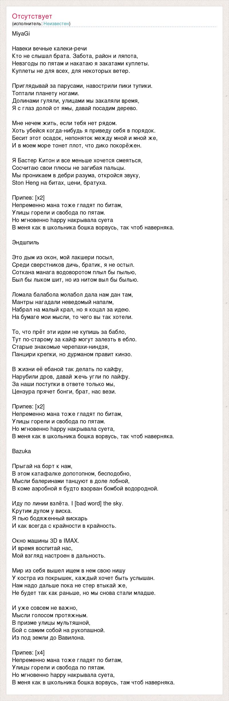 MiyaGi Навеки вечные калеки-речи Кто не слышал брата. Забота, район и ляпота, Невзгоды по пятам и накатаю я закатами куплеты. Куплеты не для всех, для некоторых ветер. Приглядывай за парусами, навострили пики тупики. Топтали планету ногами. Долинами гуляли, улицами мы закаляли время, Я с глаз долой от ямы, давай посадим дерево. Мне нечем жить, если тебя нет рядом. Хоть убейся когда-нибудь я приведу себя в порядок. Бесит этот осадок, непоняток между мной и мной же, И в моем море тонет плот, что дико покорёжен. Я Бастер Китон и все меньше хочется смеяться, Сосчитаю свои плюсы не загибая пальцы. Мы проникаем в дебри разума, откройся звуку, Ston Heng на битах, цени, братуха. Припев: [х2] Непременно мана тоже гладят по битам, Улицы горели и свобода по пятам. Но мгновенно happy накрывала суета В меня как в школьника бошка ворвусь, так чтоб наверняка. Эндшпиль Это дым из окон, мой лакшери посыл, Среди сверстников дичь, братик, я не остыл. Соткана манага водоворотом плыл бы пылью, Был бы лыком шит, но из нитом выл бы былью. Ломала балабола молабол дала нам дан там, Мантры нагадали неведомый напалм, Набрал на малый крал, но я коцал за идею. На бумаге мои мысли, то чего вы так хотели. То, что прёт эти идеи не купишь за бабло, Тут по-старому за кайф могут залезть в ебло. Старые знакомые черепахи-ниндзя, Панцири крепки, но дурманом правит кинзо. В жизни её ебаной так делать по кайфу, Нарубили дров, давай жечь угли по лайфу. За наши поступки в ответе только мы, Цензура прячет бонги, брат, нас вези. Припев: [х2] Непременно мана тоже гладят по битам, Улицы горели и свобода по пятам. Но мгновенно happy накрывала суета, В меня как в школьника бошка ворвусь, так чтоб наверняка. Bazuka Прыгай на борт к нам, В этом катафалке допотопном, бесподобно, Мысли балеринами танцуют в доле лобной, В коме аэробной я будто взорван бомбой водородной. Иду по линии взлёта. I [bad word] the sky. Крутим дулом у виска. Я пью бодяженный вискарь И как всегда с крайности в крайность. Окно машины 3D в IMAX. И время воспитай нас, Мой взгляд настроен в дальность. Мир из себя вышел ищем в нем свою нишу У костра из покрышек, каждый хочет быть услышан. Нам надо дальше пока не стер втыкай же, Не будет так как раньше, но мы снова стали младше. И уже совсем не важно, Мысли голосом протяжным. В призме улицы мультяшной, Бой с самим собой на рукопашной. Из под земли до Вавилона. Припев: [х4] Непременно мана тоже гладят по битам, Улицы горели и свобода по пятам. Но мгновенно happy накрывала суета, В меня как в школьника бошка ворвусь, там чтоб наверняка.
