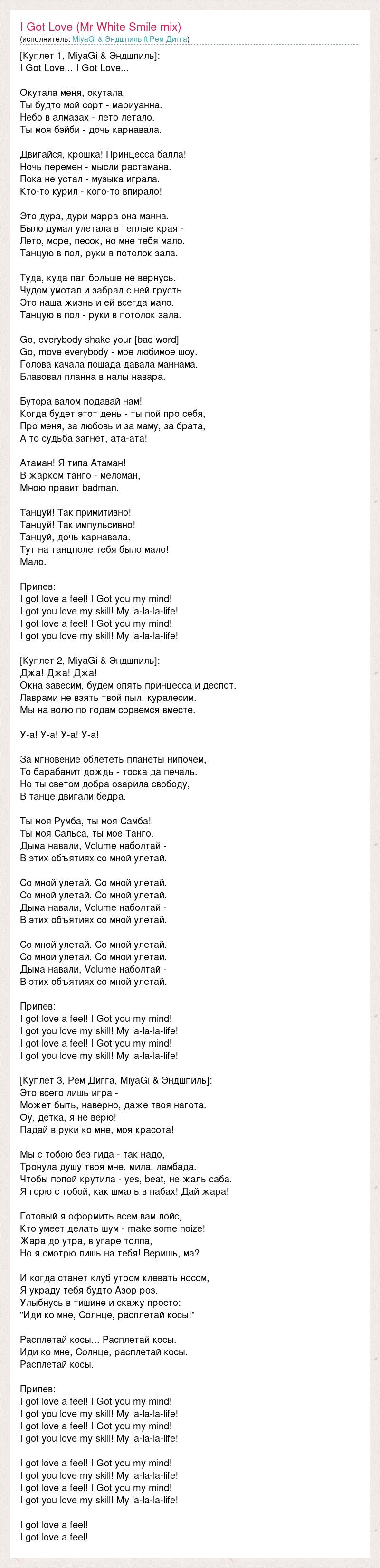 [Куплет 1, MiyaGi & Эндшпиль]: I Got Love... I Got Love... Окутала меня, окутала. Ты будто мой сорт - мариуанна. Небо в алмазах - лето летало. Ты моя бэйби - дочь карнавала. Двигайся, крошка! Принцесса балла! Ночь перемен - мысли растамана. Пока не устал - музыка играла. Кто-то курил - кого-то впирало! Это дура, дури марра она манна. Было думал улетала в теплые края - Лето, море, песок, но мне тебя мало. Танцую в пол, руки в потолок зала. Туда, куда пал больше не вернусь. Чудом умотал и забрал с ней грусть. Это наша жизнь и ей всегда мало. Танцую в пол - руки в потолок зала. Go, everybody shake your [bad word] Go, move everybody - мое любимое шоу. Голова качала пощада давала маннама. Блавовал планна в налы навара. Бутора валом подавай нам! Когда будет этот день - ты пой про себя, Про меня, за любовь и за маму, за брата, А то судьба загнет, ата-ата! Атаман! Я типа Атаман! В жарком танго - меломан, Мною правит badman. Танцуй! Так примитивно! Танцуй! Так импульсивно! Танцуй, дочь карнавала. Тут на танцполе тебя было мало! Мало. Припев: I got love a feel! I Got you my mind! I got you love my skill! My la-la-la-life! I got love a feel! I Got you my mind! I got you love my skill! My la-la-la-life! [Куплет 2, MiyaGi & Эндшпиль]: Джа! Джа! Джа! Окна завесим, будем опять принцесса и деспот. Лаврами не взять твой пыл, куралесим. Мы на волю по годам сорвемся вместе. У-а! У-а! У-а! У-а! За мгновение облететь планеты нипочем, То барабанит дождь - тоска да печаль. Но ты светом добра озарила свободу, В танце двигали бёдра. Ты моя Румба, ты моя Самба! Ты моя Сальса, ты мое Танго. Дыма навали, Volume наболтай - В этих объятиях со мной улетай. Со мной улетай. Со мной улетай. Со мной улетай. Со мной улетай. Дыма навали, Volume наболтай - В этих объятиях со мной улетай. Со мной улетай. Со мной улетай. Со мной улетай. Со мной улетай. Дыма навали, Volume наболтай - В этих объятиях со мной улетай. Припев: I got love a feel! I Got you my mind! I got you love my skill! My la-la-la-life! I got love a feel! I Got you my mind! I got you love my skill! My la-la-la-life! [Куплет 3, Рем Дигга, MiyaGi & Эндшпиль]: Это всего лишь игра - Может быть, наверно, даже твоя нагота. Оу, детка, я не верю! Падай в руки ко мне, моя красота! Мы с тобою без гида - так надо, Тронула душу твоя мне, мила, ламбада. Чтобы попой крутила - yes, beat, не жаль саба. Я горю с тобой, как шмаль в пабах! Дай жара! Готовый я оформить всем вам лойс, Кто умеет делать шум - make some noize! Жара до утра, в угаре толпа, Но я смотрю лишь на тебя! Веришь, ма? И когда станет клуб утром клевать носом, Я украду тебя будто Азор роз. Улыбнусь в тишине и скажу просто: "Иди ко мне, Солнце, расплетай косы!" Расплетай косы... Расплетай косы. Иди ко мне, Солнце, расплетай косы. Расплетай косы. Припев: I got love a feel! I Got you my mind! I got you love my skill! My la-la-la-life! I got love a feel! I Got you my mind! I got you love my skill! My la-la-la-life! I got love a feel! I Got you my mind! I got you love my skill! My la-la-la-life! I got love a feel! I Got you my mind! I got you love my skill! My la-la-la-life! I got love a feel! I got love a feel!