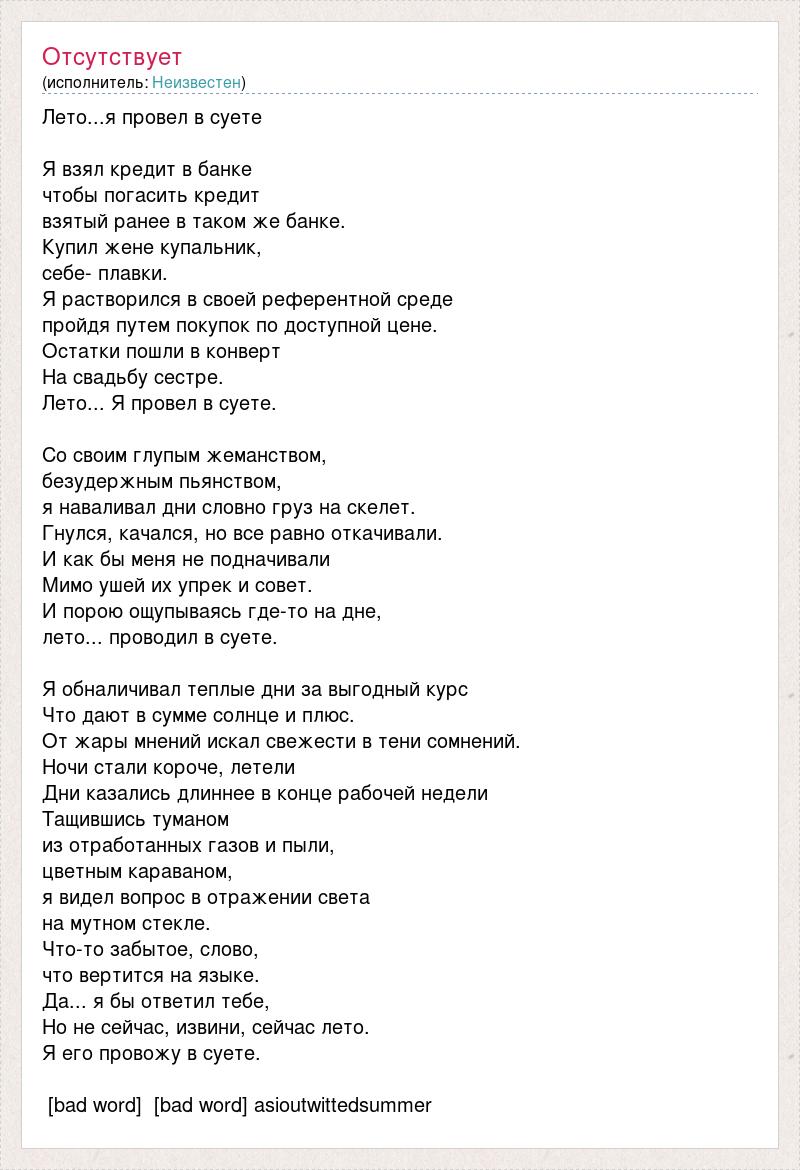Лето...я провел в суете Я взял кредит в банке чтобы погасить кредит взятый ранее в таком же банке. Купил жене купальник, себе- плавки. Я растворился в своей референтной среде пройдя путем покупок по доступной цене. Остатки пошли в конверт На свадьбу сестре. Лето... Я провел в суете. Со своим глупым жеманством, безудержным пьянством, я наваливал дни словно груз на скелет. Гнулся, качался, но все равно откачивали. И как бы меня не подначивали Мимо ушей их упрек и совет. И порою ощупываясь где-то на дне, лето... проводил в суете. Я обналичивал теплые дни за выгодный курс Что дают в сумме солнце и плюс. От жары мнений искал свежести в тени сомнений. Ночи стали короче, летели Дни казались длиннее в конце рабочей недели Тащившись туманом из отработанных газов и пыли, цветным караваном, я видел вопрос в отражении света на мутном стекле. Что-то забытое, слово, что вертится на языке. Да... я бы ответил тебе, Но не сейчас, извини, сейчас лето. Я его провожу в суете. [bad word] [bad word] asioutwittedsummer