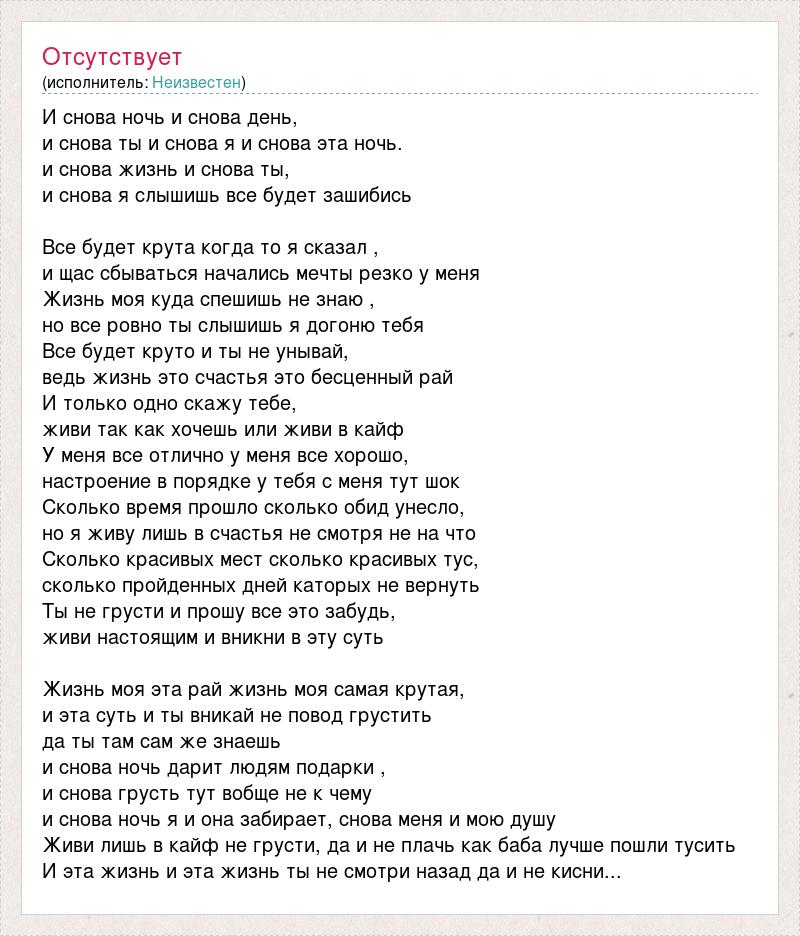 И снова ночь и снова день, и снова ты и снова я и снова эта ночь. и снова жизнь и снова ты, и снова я слышишь все будет зашибись Все будет крута когда то я сказал , и щас сбываться начались мечты резко у меня Жизнь моя куда спешишь не знаю , но все ровно ты слышишь я догоню тебя Все будет круто и ты не унывай, ведь жизнь это счастья это бесценный рай И только одно скажу тебе, живи так как хочешь или живи в кайф У меня все отлично у меня все хорошо, настроение в порядке у тебя с меня тут шок Сколько время прошло сколько обид унесло, но я живу лишь в счастья не смотря не на что Сколько красивых мест сколько красивых тус, сколько пройденных дней каторых не вернуть Ты не грусти и прошу все это забудь, живи настоящим и вникни в эту суть Жизнь моя эта рай жизнь моя самая крутая, и эта суть и ты вникай не повод грустить да ты там сам же знаешь и снова ночь дарит людям подарки , и снова грусть тут вобще не к чему и снова ночь я и она забирает, снова меня и мою душу Живи лишь в кайф не грусти, да и не плачь как баба лучше пошли тусить И эта жизнь и эта жизнь ты не смотри назад да и не кисни...