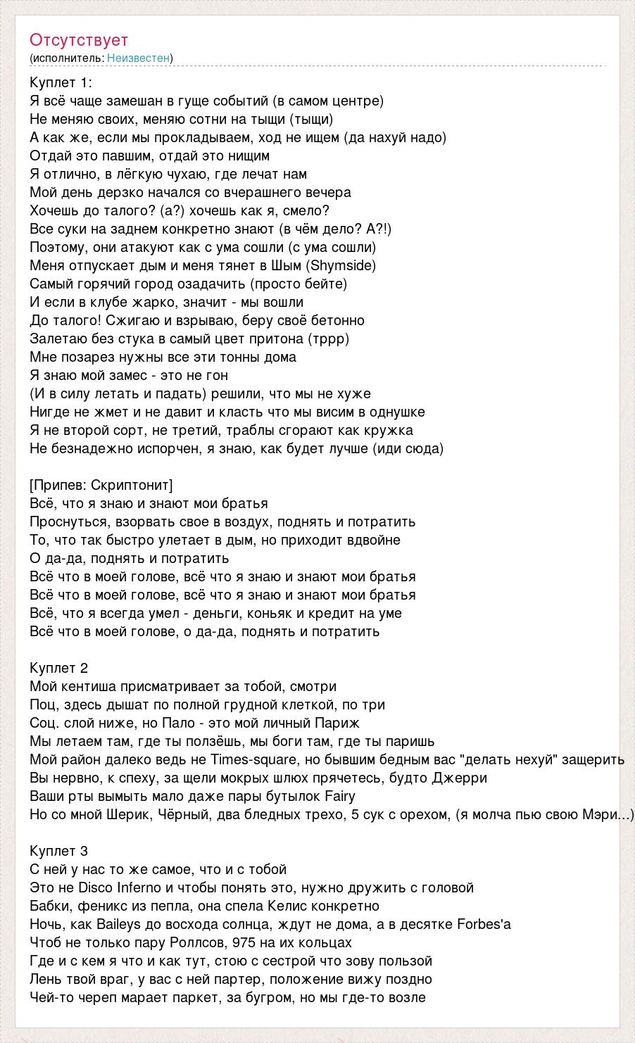 Куплет 1: Я всё чаще замешан в гуще событий (в самом центре) Не меняю своих, меняю сотни на тыщи (тыщи) А как же, если мы прокладываем, ход не ищем (да нахуй надо) Отдай это павшим, отдай это нищим Я отлично, в лёгкую чухаю, где лечат нам Мой день дерзко начался со вчерашнего вечера Хочешь до талого? (а?) хочешь как я, смело? Все суки на заднем конкретно знают (в чём дело? А?!) Поэтому, они атакуют как с ума сошли (с ума сошли) Меня отпускает дым и меня тянет в Шым (Shymside) Самый горячий город озадачить (просто бейте) И если в клубе жарко, значит - мы вошли До талого! Сжигаю и взрываю, беру своё бетонно Залетаю без стука в самый цвет притона (тррр) Мне позарез нужны все эти тонны дома Я знаю мой замес - это не гон (И в силу летать и падать) решили, что мы не хуже Нигде не жмет и не давит и класть что мы висим в однушке Я не второй сорт, не третий, траблы сгорают как кружка Не безнадежно испорчен, я знаю, как будет лучше (иди сюда) [Припев: Скриптонит] Всё, что я знаю и знают мои братья Проснуться, взорвать свое в воздух, поднять и потратить То, что так быстро улетает в дым, но приходит вдвойне О да-да, поднять и потратить Всё что в моей голове, всё что я знаю и знают мои братья Всё что в моей голове, всё что я знаю и знают мои братья Всё, что я всегда умел - деньги, коньяк и кредит на уме Всё что в моей голове, о да-да, поднять и потратить Куплет 2 Мой кентиша присматривает за тобой, смотри Поц, здесь дышат по полной грудной клеткой, по три Соц. слой ниже, но Пало - это мой личный Париж Мы летаем там, где ты ползёшь, мы боги там, где ты паришь Мой район далеко ведь не Times-square, но бывшим бедным вас "делать нехуй" защерить Вы нервно, к спеху, за щели мокрых шлюх прячетесь, будто Джерри Ваши рты вымыть мало даже пары бутылок Fairy Но со мной Шерик, Чёрный, два бледных трехо, 5 сук с орехом, (я молча пью свою Мэри...) Куплет 3 С ней у нас то же самое, что и с тобой Это не Disco Inferno и чтобы понять это, нужно дружить с головой Бабки, феникс из пепла, она спела Келис конкретно Ночь, как Baileys до восхода солнца, ждут не дома, а в десятке Forbes'а Чтоб не только пару Роллсов, 975 на их кольцах Где и с кем я что и как тут, стою с сестрой что зову пользой Лень твой враг, у вас с ней партер, положение вижу поздно Чей-то череп марает паркет, за бугром, но мы где-то возле
