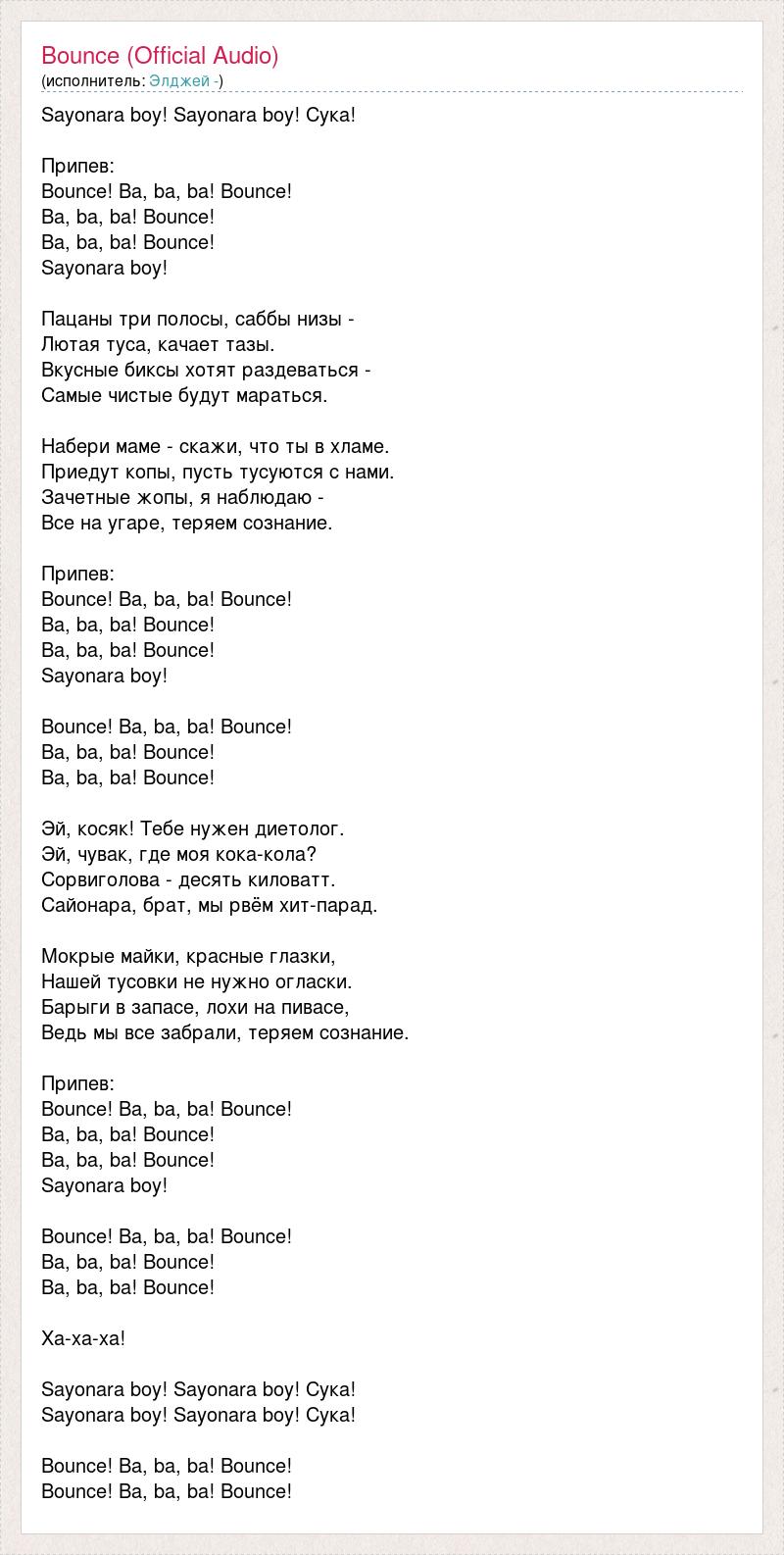 Sayonara boy! Sayonara boy! Сука! Припев: Bounce! Ba, ba, ba! Bounce! Ba, ba, ba! Bounce! Ba, ba, ba! Bounce! Sayonara boy! Пацаны три полосы, саббы низы - Лютая туса, качает тазы. Вкусные биксы хотят раздеваться - Самые чистые будут мараться. Набери маме - скажи, что ты в хламе. Приедут копы, пусть тусуются с нами. Зачетные жопы, я наблюдаю - Все на угаре, теряем сознание. Припев: Bounce! Ba, ba, ba! Bounce! Ba, ba, ba! Bounce! Ba, ba, ba! Bounce! Sayonara boy! Bounce! Ba, ba, ba! Bounce! Ba, ba, ba! Bounce! Ba, ba, ba! Bounce! Эй, косяк! Тебе нужен диетолог. Эй, чувак, где моя кока-кола? Сорвиголова - десять киловатт. Сайонара, брат, мы рвём хит-парад. Мокрые майки, красные глазки, Нашей тусовки не нужно огласки. Барыги в запасе, лохи на пивасе, Ведь мы все забрали, теряем сознание. Припев: Bounce! Ba, ba, ba! Bounce! Ba, ba, ba! Bounce! Ba, ba, ba! Bounce! Sayonara boy! Bounce! Ba, ba, ba! Bounce! Ba, ba, ba! Bounce! Ba, ba, ba! Bounce! Ха-ха-ха! Sayonara boy! Sayonara boy! Сука! Sayonara boy! Sayonara boy! Сука! Bounce! Ba, ba, ba! Bounce! Bounce! Ba, ba, ba! Bounce!