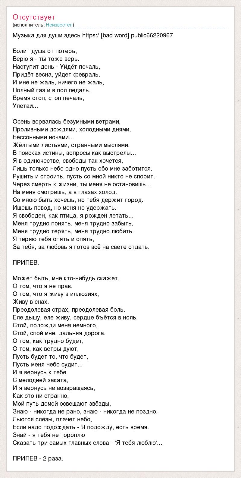 Музыка для души здесь https:/ [bad word] public66220967 Болит душа от потерь, Верю я - ты тоже верь. Наступит день - Уйдёт печаль, Придёт весна, уйдет февраль. И мне не жаль, ничего не жаль, Полный газ и в пол педаль. Время стоп, стоп печаль, Улетай... Осень ворвалась безумными ветрами, Проливными дождями, холодными днями, Бессонными ночами... Жёлтыми листьями, странными мыслями. В поисках истины, вопросы как выстрелы... Я в одиночестве, свободы так хочется, Лишь только небо одно пусть обо мне заботится. Рушить и строить, пусть со мной никто не спорит. Через смерть к жизни, ты меня не остановишь... На меня смотришь, а в глазах холод. Со мною быть хочешь, но тебя держит город. Ищешь повод, но меня не удержать. Я свободен, как птица, я рожден летать... Меня трудно понять, меня трудно забыть, Меня трудно терять, меня трудно любить. Я теряю тебя опять и опять, За тебя, за любовь я готов всё на свете отдать. ПРИПЕВ. Может быть, мне кто-нибудь скажет, О том, что я не прав. О том, что я живу в иллюзиях, Живу в снах. Преодолевая страх, преодолевая боль. Еле дышу, еле живу, сердце бъётся в ноль. Стой, подожди меня немного, Стой, спой мне, дальняя дорога. О том, как трудно будет, О том, как ветры дуют, Пусть будет то, что будет, Пусть меня небо судит... И я вернусь к тебе С мелодией заката, И я вернусь не возвращаясь, Как это ни странно, Мой путь домой освещают звёзды, Знаю - никогда не рано, знаю - никогда не поздно. Льются слёзы, плачет небо, Если надо подождать - Я подожду, есть время. Знай - я тебя не тороплю Сказать три самых главных слова - 'Я тебя люблю'... ПРИПЕВ - 2 раза.