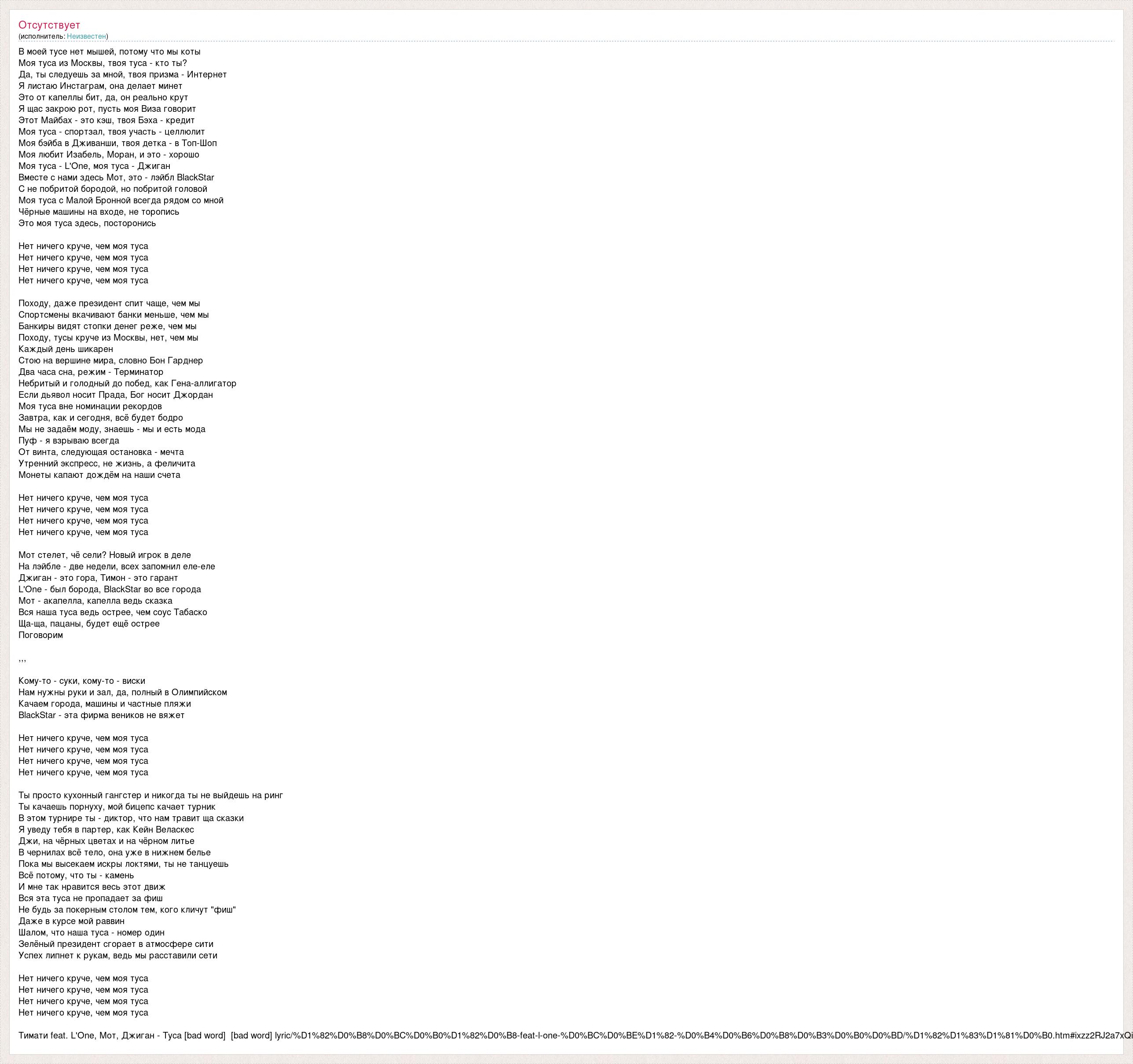 В моей тусе нет мышей, потому что мы коты Моя туса из Москвы, твоя туса - кто ты? Да, ты следуешь за мной, твоя призма - Интернет Я листаю Инстаграм, она делает минет Это от капеллы бит, да, он реально крут Я щас закрою рот, пусть моя Виза говорит Этот Майбах - это кэш, твоя Бэха - кредит Моя туса - спортзал, твоя участь - целлюлит Моя бэйба в Дживанши, твоя детка - в Топ-Шоп Моя любит Изабель, Моран, и это - хорошо Моя туса - L'One, моя туса - Джиган Вместе с нами здесь Мот, это - лэйбл BlackStar С не побритой бородой, но побритой головой Моя туса с Малой Бронной всегда рядом со мной Чёрные машины на входе, не торопись Это моя туса здесь, посторонись Нет ничего круче, чем моя туса Нет ничего круче, чем моя туса Нет ничего круче, чем моя туса Нет ничего круче, чем моя туса Походу, даже президент спит чаще, чем мы Спортсмены вкачивают банки меньше, чем мы Банкиры видят стопки денег реже, чем мы Походу, тусы круче из Москвы, нет, чем мы Каждый день шикарен Стою на вершине мира, словно Бон Гарднер Два часа сна, режим - Терминатор Небритый и голодный до побед, как Гена-аллигатор Если дьявол носит Прада, Бог носит Джордан Моя туса вне номинации рекордов Завтра, как и сегодня, всё будет бодро Мы не задаём моду, знаешь - мы и есть мода Пуф - я взрываю всегда От винта, следующая остановка - мечта Утренний экспресс, не жизнь, а феличита Монеты капают дождём на наши счета Нет ничего круче, чем моя туса Нет ничего круче, чем моя туса Нет ничего круче, чем моя туса Нет ничего круче, чем моя туса Мот стелет, чё сели? Новый игрок в деле На лэйбле - две недели, всех запомнил еле-еле Джиган - это гора, Тимон - это гарант L'One - был борода, BlackStar во все города Мот - акапелла, капелла ведь сказка Вся наша туса ведь острее, чем соус Табаско Ща-ща, пацаны, будет ещё острее Поговорим ,,, Кому-то - суки, кому-то - виски Нам нужны руки и зал, да, полный в Олимпийском Качаем города, машины и частные пляжи BlackStar - эта фирма веников не вяжет Нет ничего круче, чем моя туса Нет ничего круче, чем моя туса Нет ничего круче, чем моя туса Нет ничего круче, чем моя туса Ты просто кухонный гангстер и никогда ты не выйдешь на ринг Ты качаешь порнуху, мой бицепс качает турник В этом турнире ты - диктор, что нам травит ща сказки Я уведу тебя в партер, как Кейн Веласкес Джи, на чёрных цветах и на чёрном литье В чернилах всё тело, она уже в нижнем белье Пока мы высекаем искры локтями, ты не танцуешь Всё потому, что ты - камень И мне так нравится весь этот движ Вся эта туса не пропадает за фиш Не будь за покерным столом тем, кого кличут "фиш" Даже в курсе мой раввин Шалом, что наша туса - номер один Зелёный президент сгорает в атмосфере сити Успех липнет к рукам, ведь мы расставили сети Нет ничего круче, чем моя туса Нет ничего круче, чем моя туса Нет ничего круче, чем моя туса Нет ничего круче, чем моя туса Тимати feat. L'One, Мот, Джиган - Туса [bad word] [bad word] lyric/%D1%82%D0%B8%D0%BC%D0%B0%D1%82%D0%B8-feat-l-one-%D0%BC%D0%BE%D1%82-%D0%B4%D0%B6%D0%B8%D0%B3%D0%B0%D0%BD/%D1%82%D1%83%D1%81%D0%B0.htm#ixzz2RJ2a7xQi