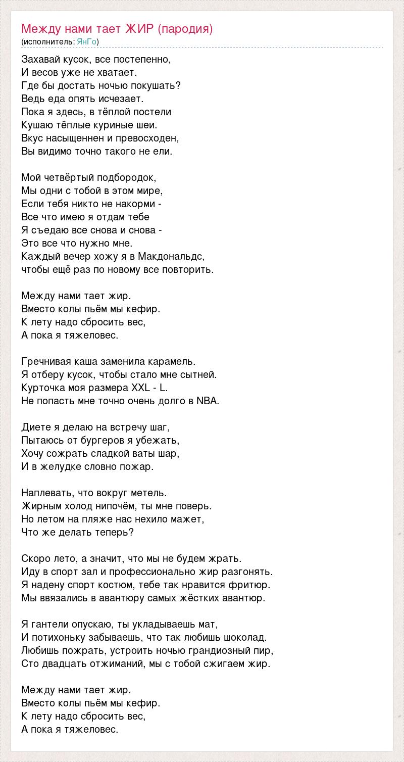 Захавай кусок, все постепенно, И весов уже не хватает. Где бы достать ночью покушать? Ведь еда опять исчезает. Пока я здесь, в тёплой постели Кушаю тёплые куриные шеи. Вкус насыщеннен и превосходен, Вы видимо точно такого не ели. Мой четвёртый подбородок, Мы одни с тобой в этом мире, Если тебя никто не накорми - Все что имею я отдам тебе Я съедаю все снова и снова - Это все что нужно мне. Каждый вечер хожу я в Макдональдс, чтобы ещё раз по новому все повторить. Между нами тает жир. Вместо колы пьём мы кефир. К лету надо сбросить вес, А пока я тяжеловес. Гречнивая каша заменила карамель. Я отберу кусок, чтобы стало мне сытней. Курточка моя размера ХХL - L. Не попасть мне точно очень долго в NBA. Диете я делаю на встречу шаг, Пытаюсь от бургеров я убежать, Хочу сожрать сладкой ваты шар, И в желудке словно пожар. Наплевать, что вокруг метель. Жирным холод нипочём, ты мне поверь. Но летом на пляже нас нехило мажет, Что же делать теперь? Скоро лето, а значит, что мы не будем жрать. Иду в спорт зал и профессионально жир разгонять. Я надену спорт костюм, тебе так нравится фритюр. Мы ввязались в авантюру самых жёстких авантюр. Я гантели опускаю, ты укладываешь мат, И потихоньку забываешь, что так любишь шоколад. Любишь пожрать, устроить ночью грандиозный пир, Сто двадцать отжиманий, мы с тобой сжигаем жир. Между нами тает жир. Вместо колы пьём мы кефир. К лету надо сбросить вес, А пока я тяжеловес.
