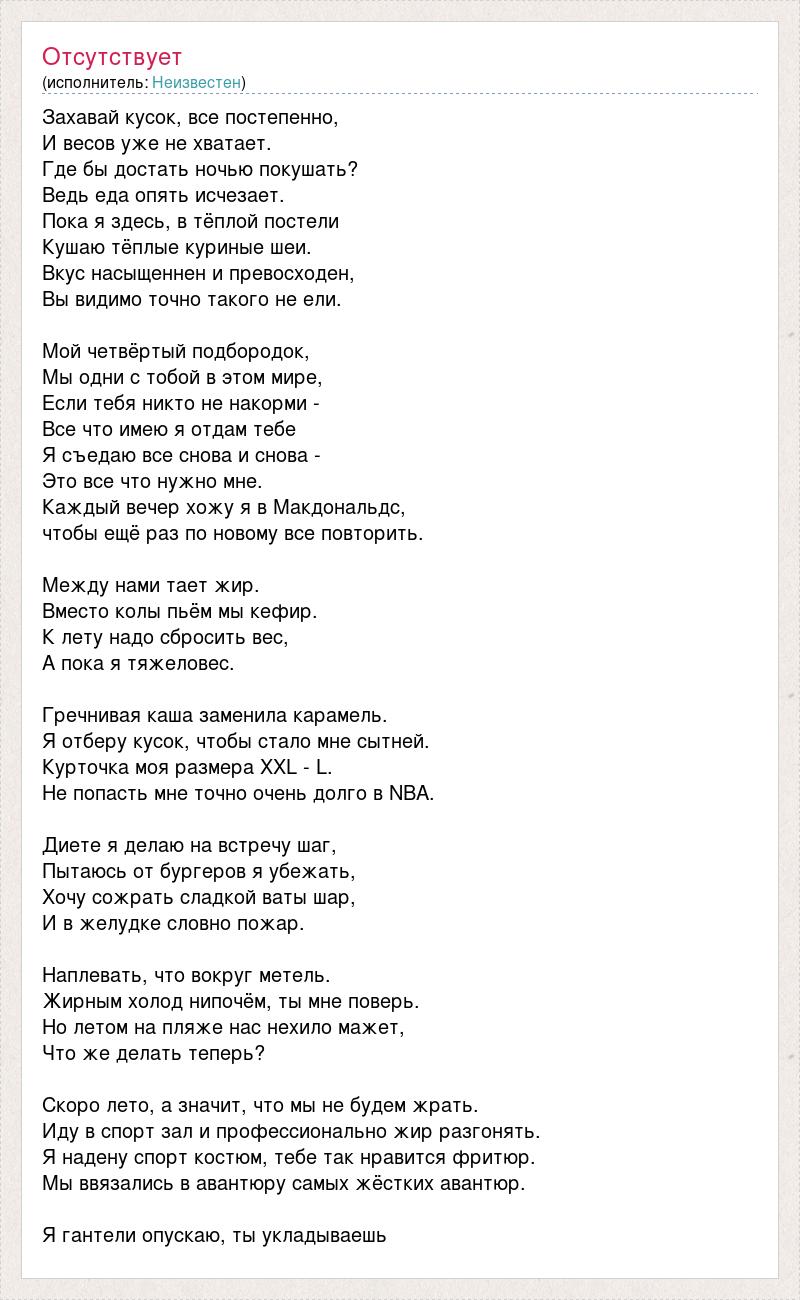Захавай кусок, все постепенно, И весов уже не хватает. Где бы достать ночью покушать? Ведь еда опять исчезает. Пока я здесь, в тёплой постели Кушаю тёплые куриные шеи. Вкус насыщеннен и превосходен, Вы видимо точно такого не ели. Мой четвёртый подбородок, Мы одни с тобой в этом мире, Если тебя никто не накорми - Все что имею я отдам тебе Я съедаю все снова и снова - Это все что нужно мне. Каждый вечер хожу я в Макдональдс, чтобы ещё раз по новому все повторить. Между нами тает жир. Вместо колы пьём мы кефир. К лету надо сбросить вес, А пока я тяжеловес. Гречнивая каша заменила карамель. Я отберу кусок, чтобы стало мне сытней. Курточка моя размера ХХL - L. Не попасть мне точно очень долго в NBA. Диете я делаю на встречу шаг, Пытаюсь от бургеров я убежать, Хочу сожрать сладкой ваты шар, И в желудке словно пожар. Наплевать, что вокруг метель. Жирным холод нипочём, ты мне поверь. Но летом на пляже нас нехило мажет, Что же делать теперь? Скоро лето, а значит, что мы не будем жрать. Иду в спорт зал и профессионально жир разгонять. Я надену спорт костюм, тебе так нравится фритюр. Мы ввязались в авантюру самых жёстких авантюр. Я гантели опускаю, ты укладываешь