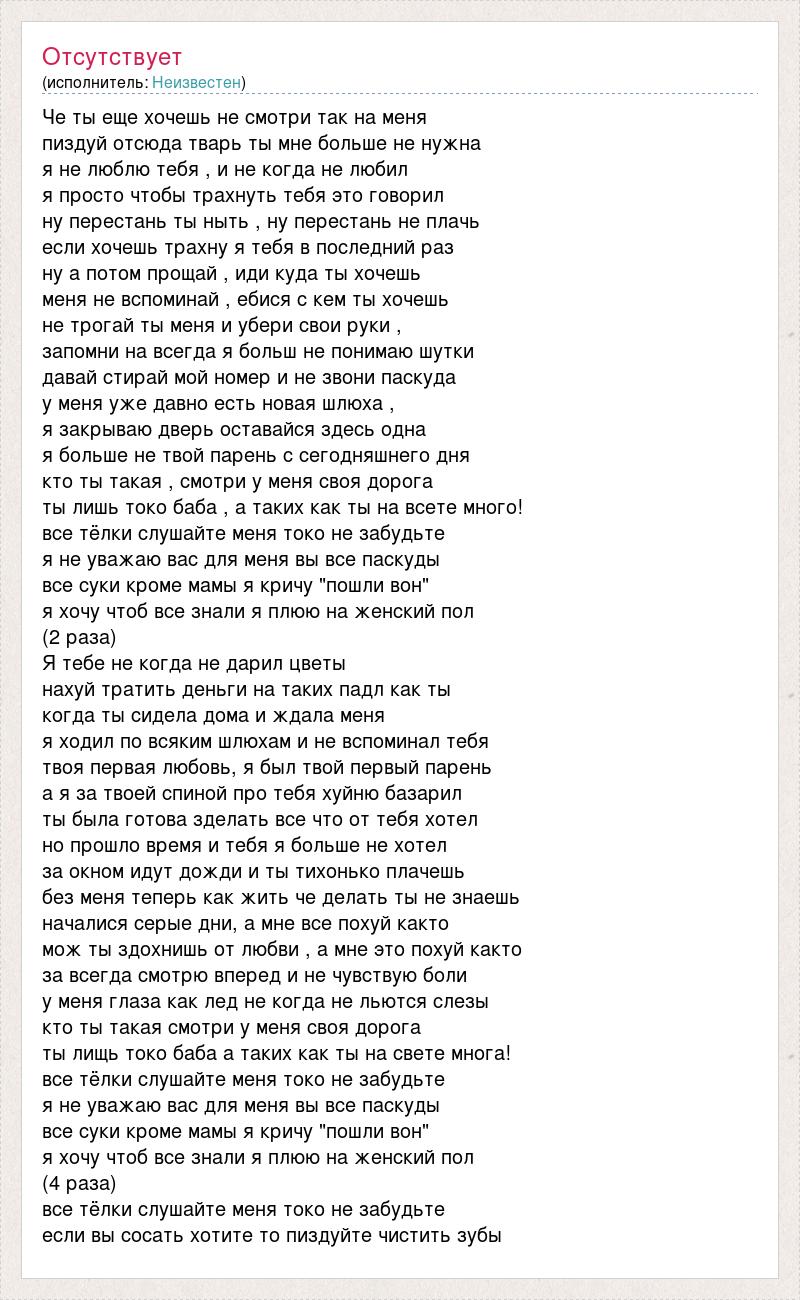 Че ты еще хочешь не смотри так на меня пиздуй отсюда тварь ты мне больше не нужна я не люблю тебя , и не когда не любил я просто чтобы трахнуть тебя это говорил ну перестань ты ныть , ну перестань не плачь если хочешь трахну я тебя в последний раз ну а потом прощай , иди куда ты хочешь меня не вспоминай , ебися с кем ты хочешь не трогай ты меня и убери свои руки , запомни на всегда я больш не понимаю шутки давай стирай мой номер и не звони паскуда у меня уже давно есть новая шлюха , я закрываю дверь оставайся здесь одна я больше не твой парень с сегодняшнего дня кто ты такая , смотри у меня своя дорога ты лишь токо баба , а таких как ты на всете много! все тёлки слушайте меня токо не забудьте я не уважаю вас для меня вы все паскуды все суки кроме мамы я кричу "пошли вон" я хочу чтоб все знали я плюю на женский пол (2 раза) Я тебе не когда не дарил цветы нахуй тратить деньги на таких падл как ты когда ты сидела дома и ждала меня я ходил по всяким шлюхам и не вспоминал тебя твоя первая любовь, я был твой первый парень а я за твоей спиной про тебя хуйню базарил ты была готова зделать все что от тебя хотел но прошло время и тебя я больше не хотел за окном идут дожди и ты тихонько плачешь без меня теперь как жить че делать ты не знаешь началися серые дни, а мне все похуй както мож ты здохнишь от любви , а мне это похуй както за всегда смотрю вперед и не чувствую боли у меня глаза как лед не когда не льются слезы кто ты такая смотри у меня своя дорога ты лищь токо баба а таких как ты на свете многа! все тёлки слушайте меня токо не забудьте я не уважаю вас для меня вы все паскуды все суки кроме мамы я кричу "пошли вон" я хочу чтоб все знали я плюю на женский пол (4 раза) все тёлки слушайте меня токо не забудьте если вы сосать хотите то пиздуйте чистить зубы