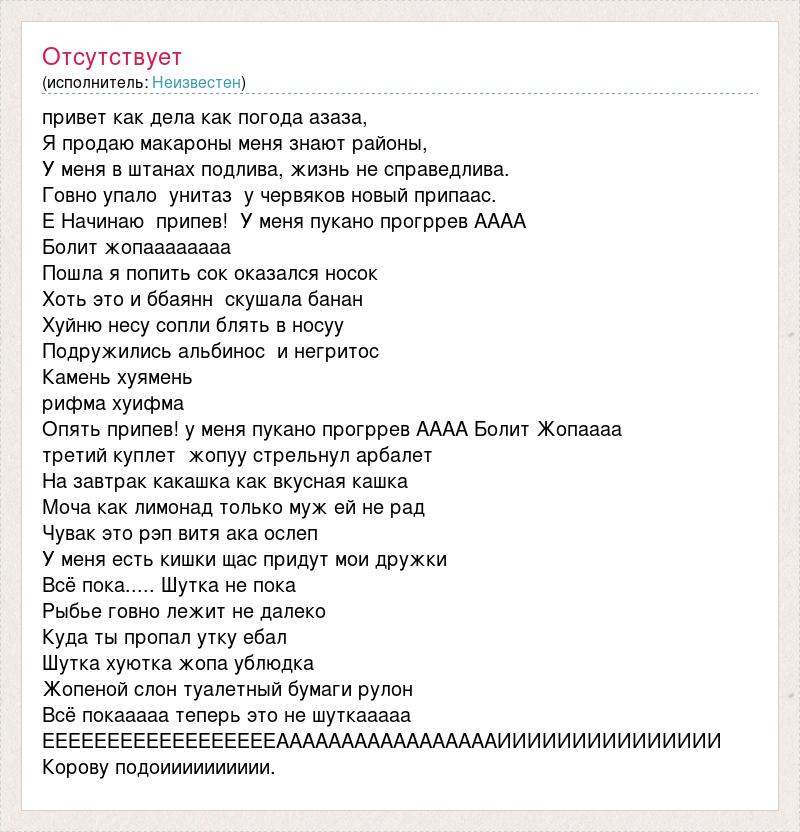 привет как дела как погода азаза, Я продаю макароны меня знают районы, У меня в штанах подлива, жизнь не справедлива. Говно упало унитаз у червяков новый припаас. Е Начинаю припев! У меня пукано прогррев АААА Болит жопаааааааа Пошла я попить сок оказался носок Хоть это и ббаянн скушала банан Хуйню несу сопли блять в носуу Подружились альбинос и негритос Камень хуямень рифма хуифма Опять припев! у меня пукано прогррев АААА Болит Жопаааа третий куплет жопуу стрельнул арбалет На завтрак какашка как вкусная кашка Моча как лимонад только муж ей не рад Чувак это рэп витя ака ослеп У меня есть кишки щас придут мои дружки Всё пока..... Шутка не пока Рыбье говно лежит не далеко Куда ты пропал утку ебал Шутка хуютка жопа ублюдка Жопеной слон туалетный бумаги рулон Всё покааааа теперь это не шуткааааа ЕЕЕЕЕЕЕЕЕЕЕЕЕЕЕЕЕЕАААААААААААААААААИИИИИИИИИИИИИИИ Корову подоииииииииии.