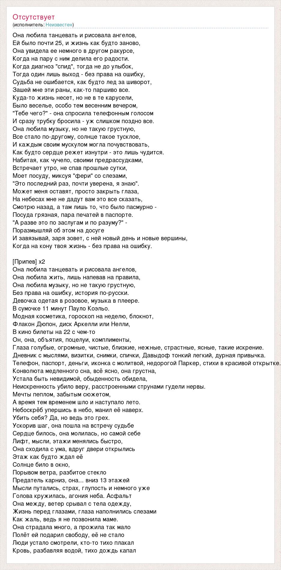 Она любила танцевать и рисовала ангелов, Ей было почти 25, и жизнь как будто заново, Она увидела ее немного в другом ракурсе, Когда на пару с ним делила его радости. Когда диагноз "спид", тогда не до улыбок, Тогда один лишь выход - без права на ошибку, Судьба не ошибается, как будто лед за шиворот, Зашей мне эти раны, как-то паршиво все. Куда-то жизнь несет, но не в те карусели, Было веселье, особо тем весенним вечером, "Тебе чего?" - она спросила телефонным голосом И сразу трубку бросила - уж слишком поздно все. Она любила музыку, но не такую грустную, Все стало по-другому, солнце такое тусклое, И каждым своим мускулом могла почувствовать, Как будто сердце режет изнутри - это лишь чудится. Набитая, как чучело, своими предрассудками, Встречает утро, не спав прошлые сутки, Моет посуду, миксуя "фери" со слезами, "Это последний раз, почти уверена, я знаю". Может меня оставят, просто закрыть глаза, На небесах мне не дадут вам это все сказать, Смотрю назад, а там лишь то, что было пасмурно - Посуда грязная, пара печатей в паспорте. "А разве это по заслугам и по разуму?" - Поразмышляй об этом на досуге И завязывай, заря зовет, с ней новый день и новые вершины, Когда на кону твоя жизнь - без права на ошибку. [Припев] x2 Она любила танцевать и рисовала ангелов, Она любила жить, лишь напевав на правила, Она любила музыку, но не такую грустную, Без права на ошибку, история по-русски. Девочка одетая в розовое, музыка в плеере. В сумочке 11 минут Пауло Коэльо. Модная косметика, гороскоп на неделю, блокнот, Флакон Дюпон, диск Аркелли или Нелли, В кино билеты на 22 с чем-то Он, она, объятия, поцелуи, комплименты, Глаза голубые, огромные, чистые, близкие, нежные, страстные, ясные, такие искрение. Дневник с мыслями, визитки, снимки, спички, Давыдоф тонкий легкий, дурная привычка. Телефон, паспорт, деньги, иконка с молитвой, недорогой Паркер, стихи в красивой открытке. Конволюта медленного сна, всё ясно, она грустна, Устала быть невидимой, обыденность обидела, Неискренность убило веру, расстроенными струнами гудели нервы. Мечты пеплом, забытым сюжетом, А время тем временем шло и наступало лето. Небоскрёб упершись в небо, манил её наверх. Убить себя? Да, но ведь это грех. Ускорив шаг, она пошла на встречу судьбе Сердце билось, она молилась, но самой себе Лифт, мысли, этажи менялись быстро, Она сходила с ума, вдруг двери открылись Этаж как будто ждал её Солнце било в окно, Порывом ветра, разбитое стекло Предатель карниз, она... вниз 13 этажей Мысли путались, страх, глупость и немного уже Голова кружилась, агония неба. Асфальт Она между, ветер срывал с тела одежду, Жизнь перед глазами, глаза наполнились слезами Как жаль, ведь я не позвонила маме. Она страдала много, а прожила так мало Полёт ей подарил свободу, её не стало Люди устало смотрели, кто-то тихо плакал Кровь, разбавляя водой, тихо дождь капал