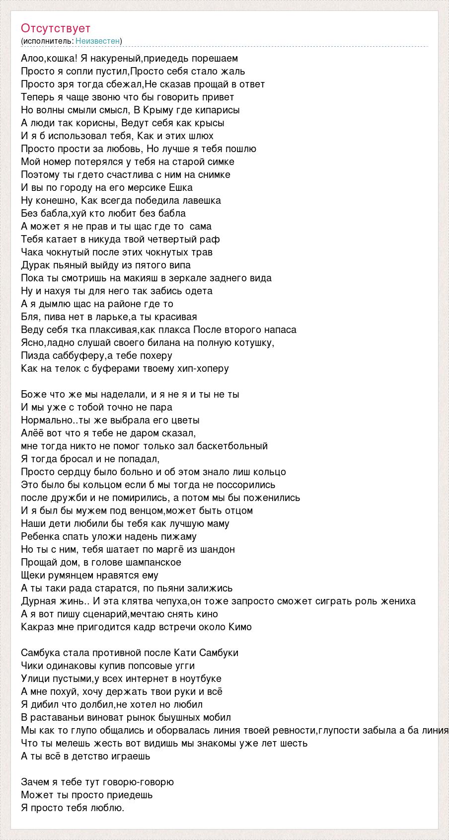 Алоо,кошка! Я накуреный,приедедь порешаем Просто я сопли пустил,Просто себя стало жаль Просто зря тогда сбежал,Не сказав прощай в ответ Теперь я чаще звоню что бы говорить привет Но волны смыли смысл, В Крыму где кипарисы А люди так корисны, Ведут себя как крысы И я б использовал тебя, Как и этих шлюх Просто прости за любовь, Но лучше я тебя пошлю Мой номер потерялся у тебя на старой симке Поэтому ты гдето счастлива с ним на снимке И вы по городу на его мерсике Ешка Ну конешно, Как всегда победила лавешка Без бабла,хуй кто любит без бабла А может я не прав и ты щас где то сама Тебя катает в никуда твой четвертый раф Чака чокнутый после этих чокнутых трав Дурак пьяный выйду из пятого випа Пока ты смотришь на макияш в зеркале заднего вида Ну и нахуя ты для него так забись одета А я дымлю щас на районе где то Бля, пива нет в ларьке,а ты красивая Веду себя тка плаксивая,как плакса После второго напаса Ясно,ладно слушай своего билана на полную котушку, Пизда саббуферу,а тебе похеру Как на телок с буферами твоему хип-хоперу Боже что же мы наделали, и я не я и ты не ты И мы уже с тобой точно не пара Нормально..ты же выбрала его цветы Алёё вот что я тебе не даром сказал, мне тогда никто не помог только зал баскетбольный Я тогда бросал и не попадал, Просто сердцу было больно и об этом знало лиш кольцо Это было бы кольцом если б мы тогда не поссорились после дружби и не помирились, а потом мы бы поженились И я был бы мужем под венцом,может быть отцом Наши дети любили бы тебя как лучшую маму Ребенка спать уложи надень пижаму Но ты с ним, тебя шатает по маргё из шандон Прощай дом, в голове шампанское Щеки румянцем нравятся ему А ты таки рада старатся, по пьяни залижись Дурная жинь.. И эта клятва чепуха,он тоже запросто сможет сиграть роль жениха А я вот пишу сценарий,мечтаю снять кино Какраз мне пригодится кадр встречи около Кимо Самбука стала противной после Кати Самбуки Чики одинаковы купив попсовые угги Улици пустыми,у всех интернет в ноутбуке А мне похуй, хочу держать твои руки и всё Я дибил что долбил,не хотел но любил В раставаньи виноват рынок быушных мобил Мы как то глупо общались и оборвалась линия твоей ревности,глупости забыла а ба линия Что ты мелешь жесть вот видишь мы знакомы уже лет шесть А ты всё в детство играешь Зачем я тебе тут говорю-говорю Может ты просто приедешь Я просто тебя люблю.