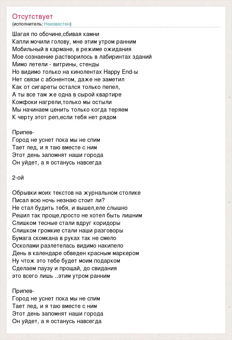 Шагая по обочине,сбивая камни Капли мочили голову, мне этим утром ранним Мобильный в кармане, в режиме ожидания Мое сознаение растворилось в лабиринтах зданий Мимо летели - витрины, стенды Но видимо только на кинолентах Happy End-ы Нет связи с абонентом, даже не заметил Как от сигареты остался только пепел, А ты все там же одна в сырой квартире Комфоки нагрели,только мы остыли Мы начинаем ценить только когда теряем К черту этот реп,если тебя нет рядом Припев- Город не уснет пока мы не спим Тает лед, и я таю вместе с ним Этот день запомнят наши города Он уйдет, а я останусь навсегда 2-ой Обрывки моих текстов на журнальном столике Писал всю ночь незнаю стоит ли? Не стал будить тебя, и вышел,еле слышно Решил так проще,просто не хотел быть лишним Слишком тесные стали вдруг коридоры Слишком громкие стали наши разговоры Бумага скомкана в руках так не смело Осколами разлетелась видимо накипело День в календаре обведен красным маркером Ну чтож это тебе будет моим подарком Сделаем паузу и прощай, до свидания это всего лишь ..этим утром ранним Припев- Город не уснет пока мы не спим Тает лед, и я таю вместе с ним Этот день запомнят наши города Он уйдет, а я останусь навсегда